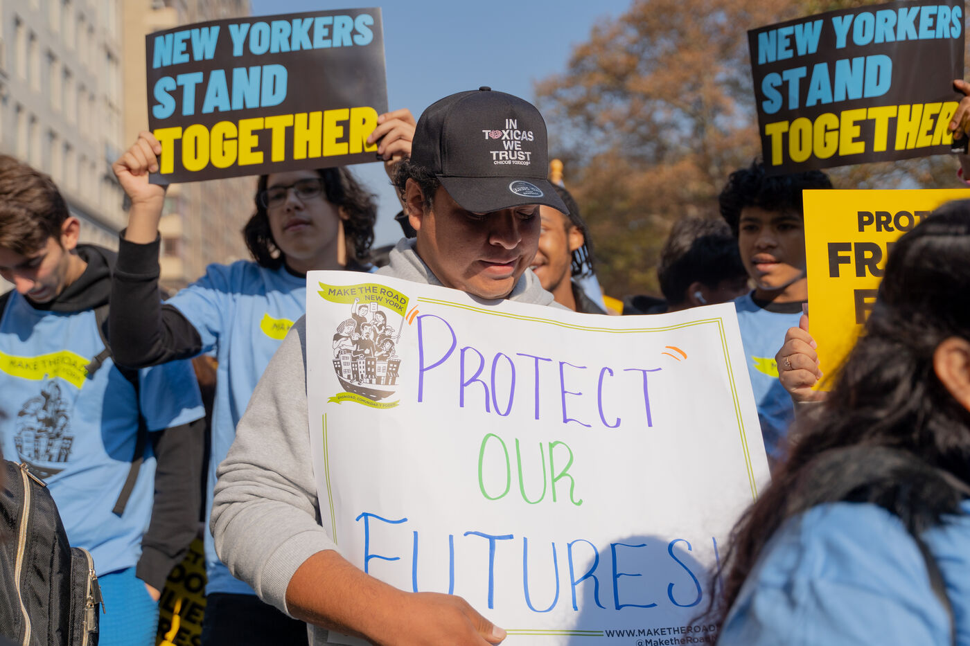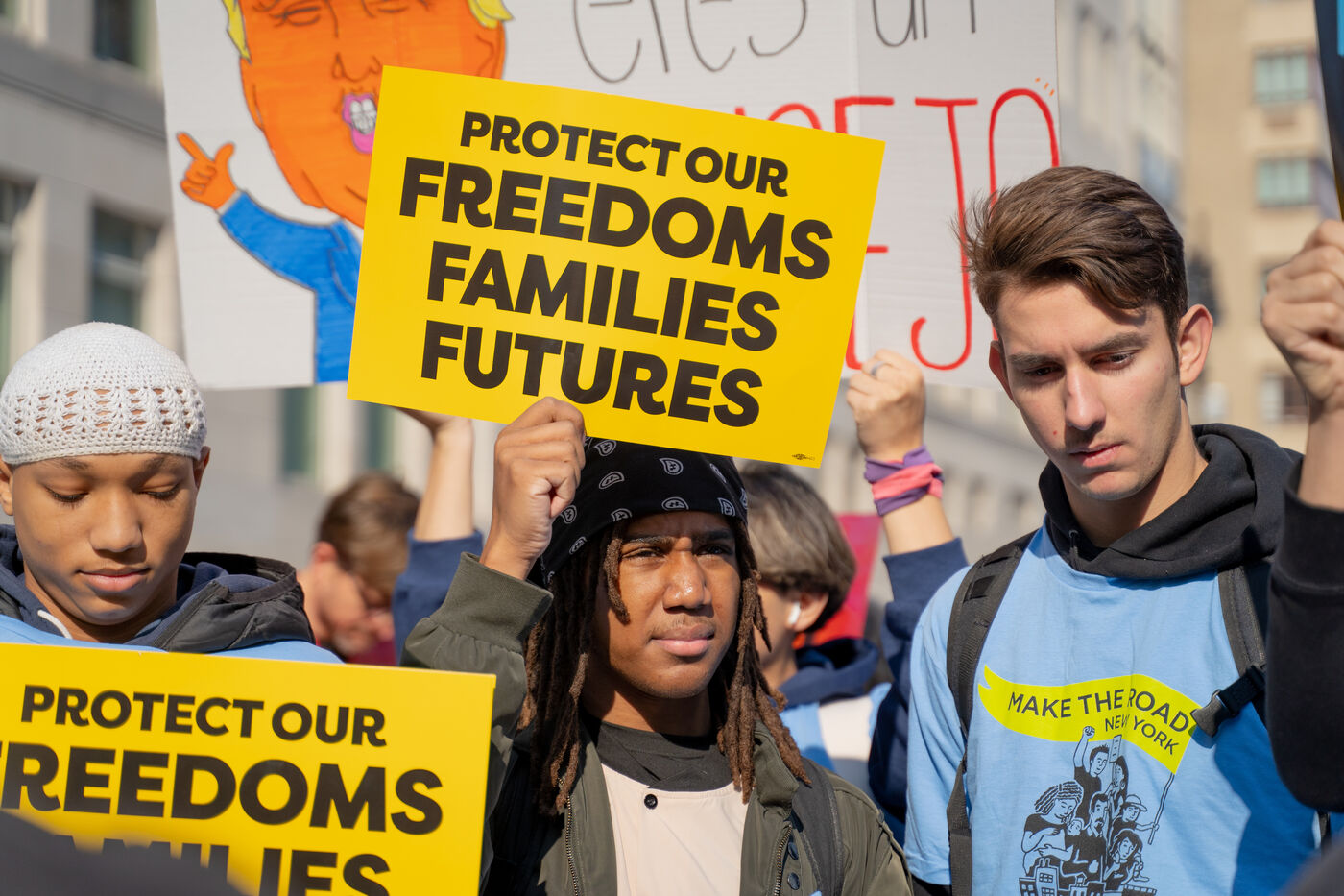 Suite au résultat de élection présidentielle et à l'élection de Donald Trump, le collectif Make the Road New York, suivi d'une trentaine d'associations et de collectifs, ont organisé une manifestation de résistance au deuxième mandat de Donald Trump et pour montrer qu'à New York, les militants continueront de manifester pour les droits des immigrés, des travailleurs, des jeunes, des femmes, de la communauté LGBT+.