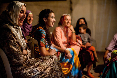 Les femmes discutent entre elles pendant la préparation du repas, les enfants jouent sur les toits, les plats arrivent sur les tables.