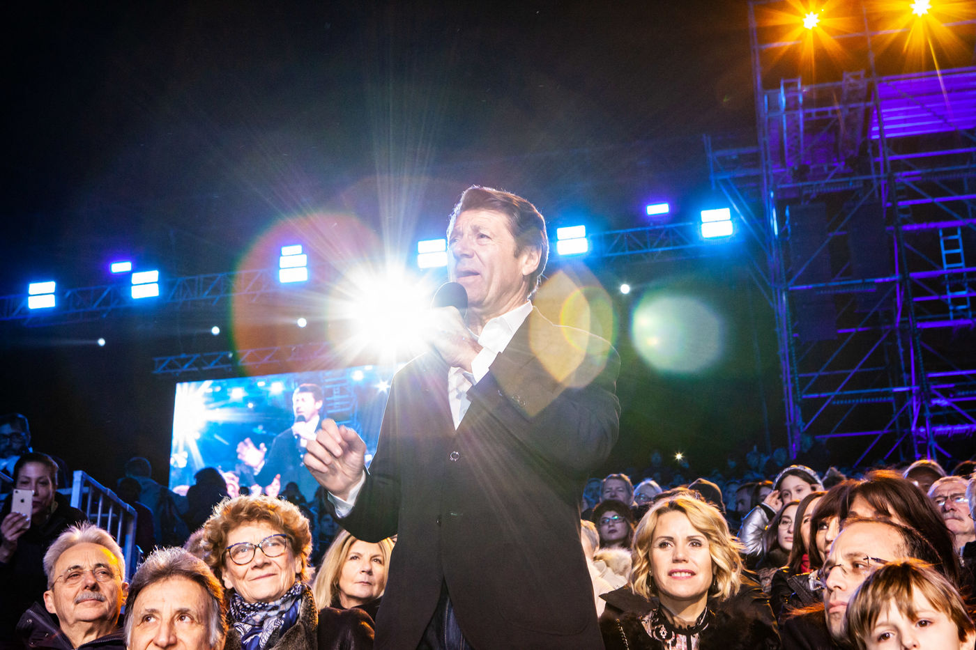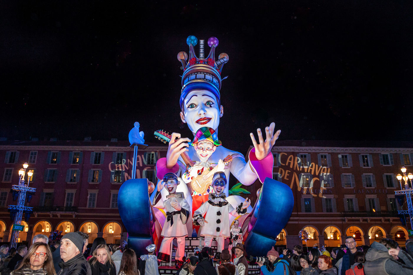 Sur la place Masséna, les animations visuelles sont diffusées sur de grands écrans... Le soir, tous les chars sont éclairés, le corso carnavalesque illumine alors le coeur de Nice. 17 chars et plus de 1000 danseurs et musiciens sont venus spécialement des 4 coins du monde.