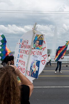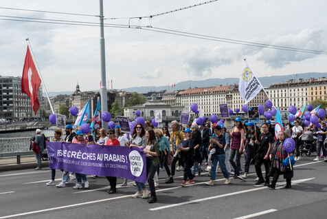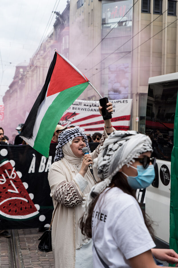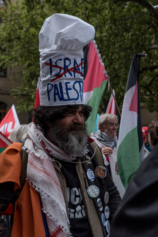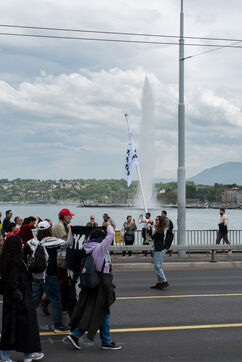 À l'occasion du 1er Mai et de la fête du travail, bien que ce jour ne soit pas férié à Genève en Suisse, la population s'est tout de même réunie pour défiler en cortège et proner diverses revendications. En tête et fin de cortège, un bloc pro-Palestinien très présent.