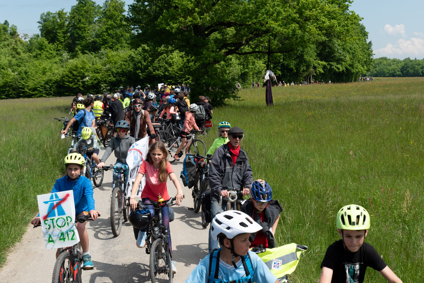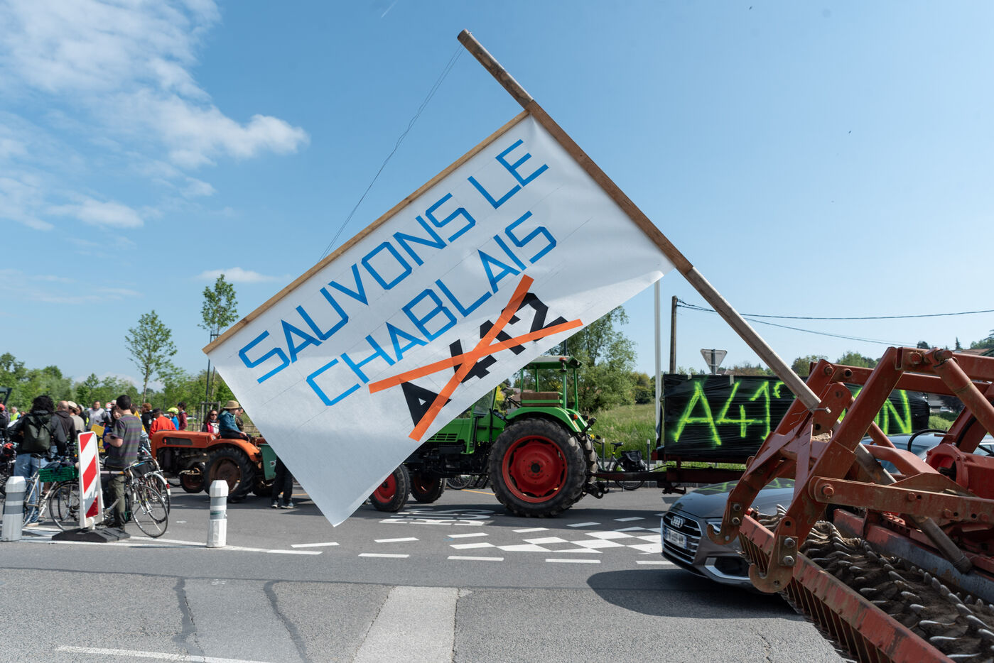 In the Chablais region of Haute-Savoie, a "rally and festive convoy against the A412" was organised by La Confédération paysanne 74, Les Ecologistes des Pays de Savoie and ACPAT (Association de Concertation et de Proposition pour l'Aménagement et les Transports). On tractors, bicycles and on foot, citizens took to the roads and paths around the route of the future motorway between Machilly and Perrigner on Saturday 10 May 2025.