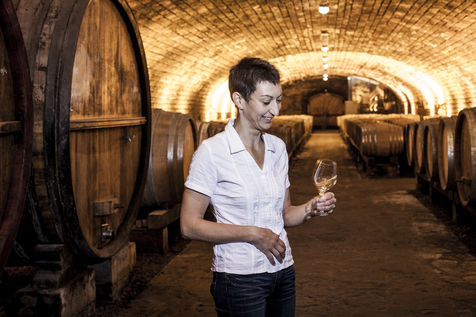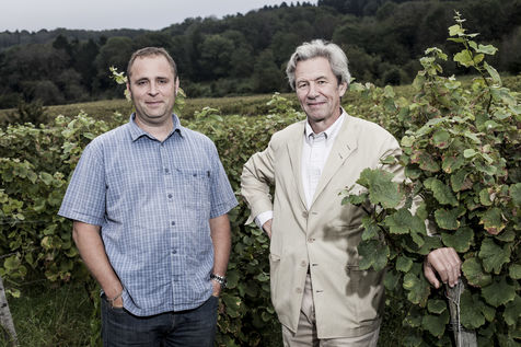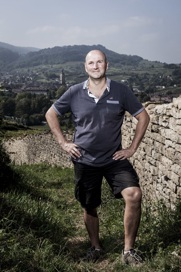 Des vignerons, propriétaires récoltant sur les vignobles du Jura photographiés pour illustrer des articles de magazines.