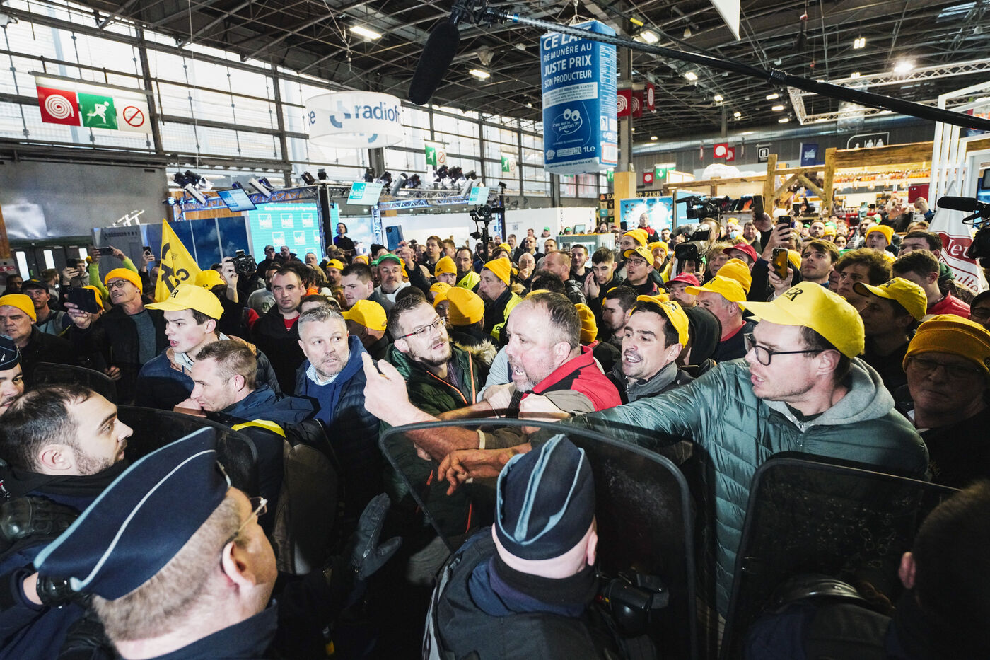Dozens of demonstrators force their way into the Salon de l'Agriculture at around 8am for Emmanuel Macron's arrival. Parc des expositions de la Porte de Versailles, Paris, Saturday, February 24, 2024. Photograph by Daniel Dorko / Hans Lucas.