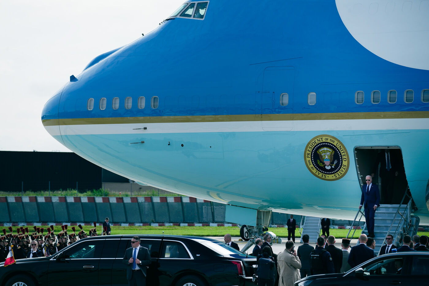 Reception of Joe BIDEN, President of the United States of America, by Prime Minister Gabriel ATTAL at the Honorary Pavilion of the Paris Orly airport in Orly, France, on June 5th, 2024.