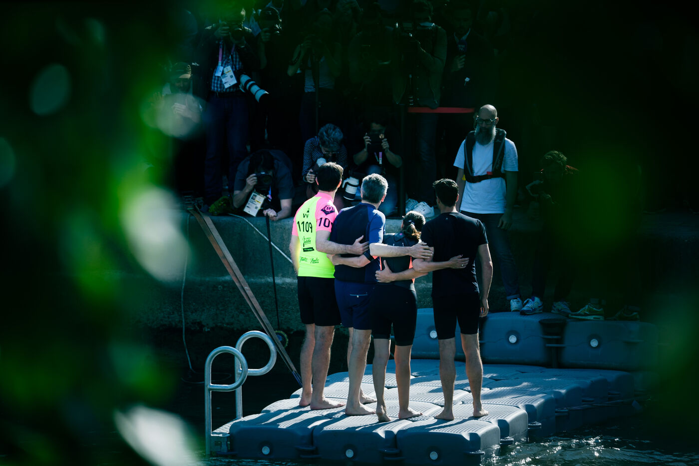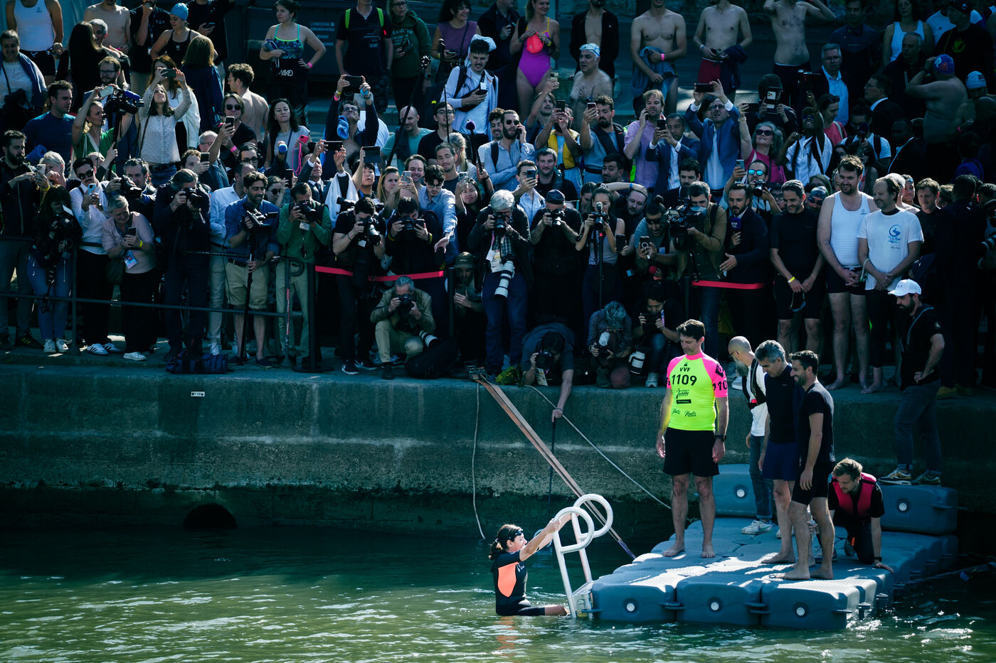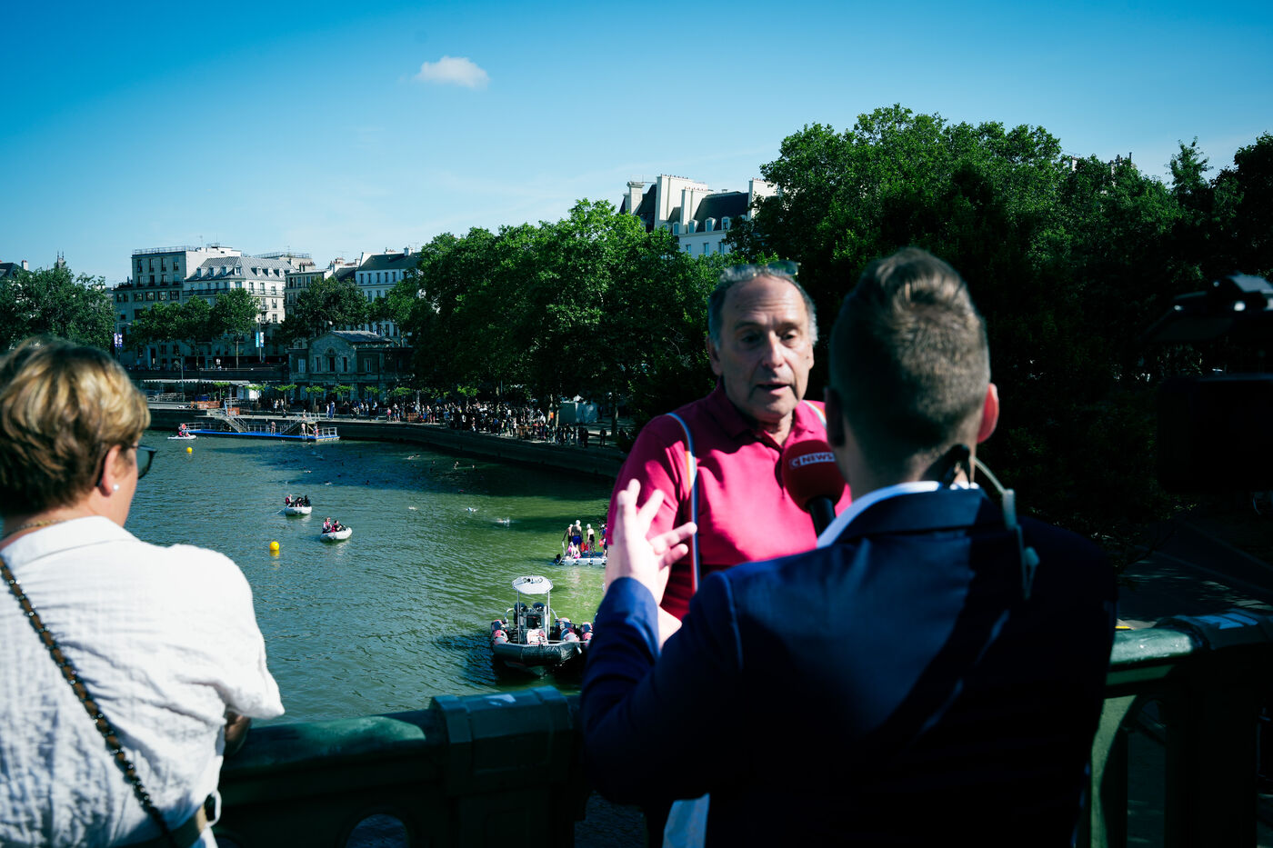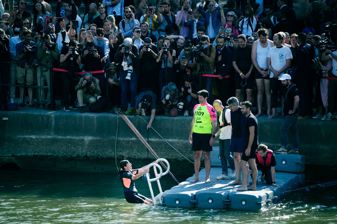Baignade d Anna Hidalgo, maire de Paris et Tony Estanguet, president du comite d organisation dans la Seine avant des Jeux de Paris 2024 avant le Jeux Olympiques d ete de Paris 2024 a Paris, France, le 17 juillet 2024.