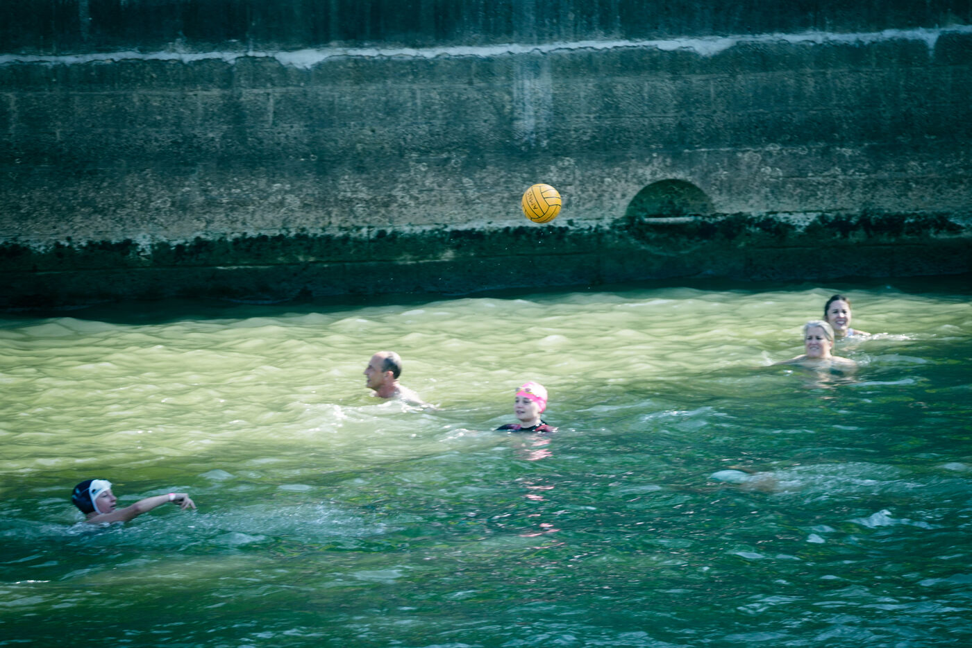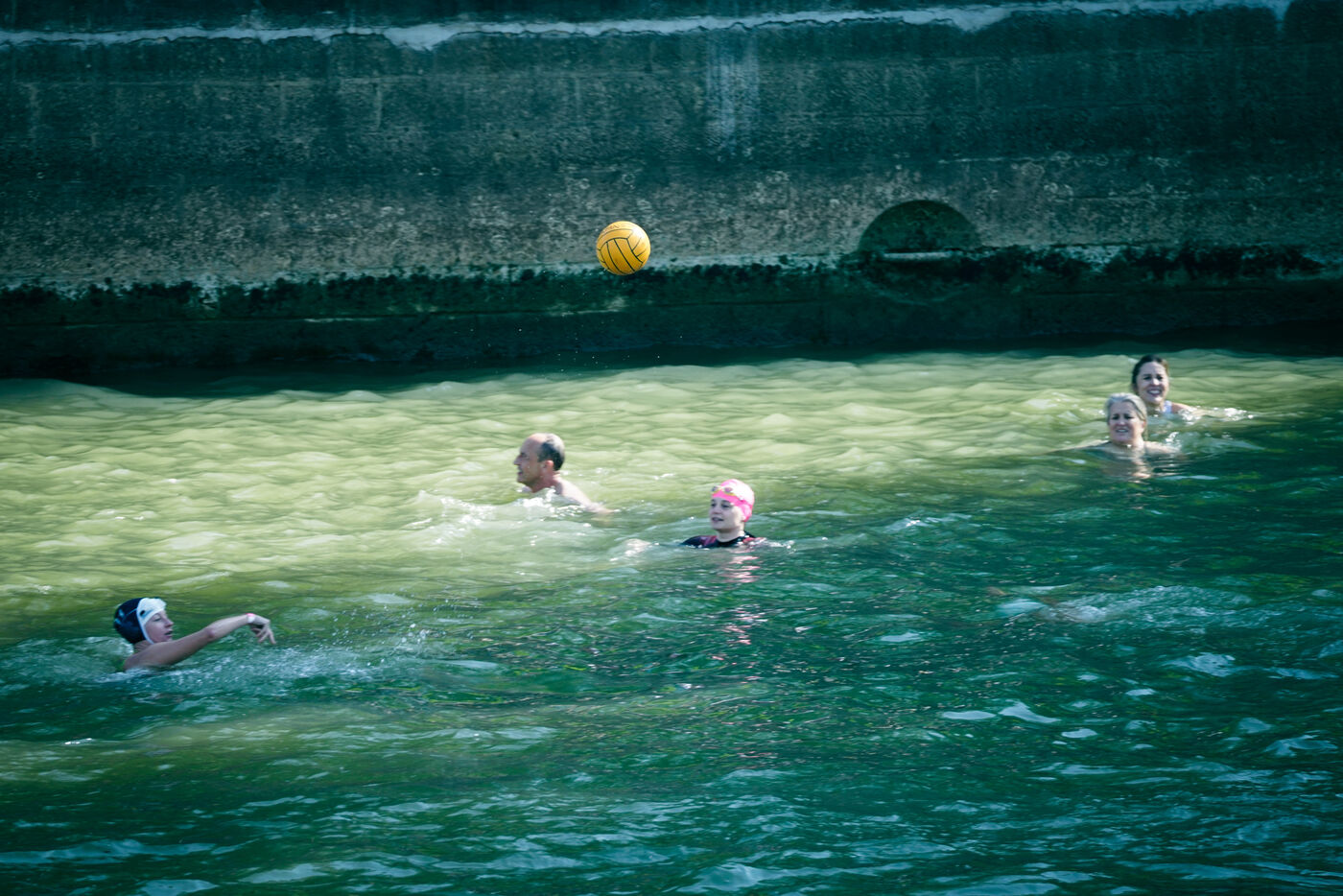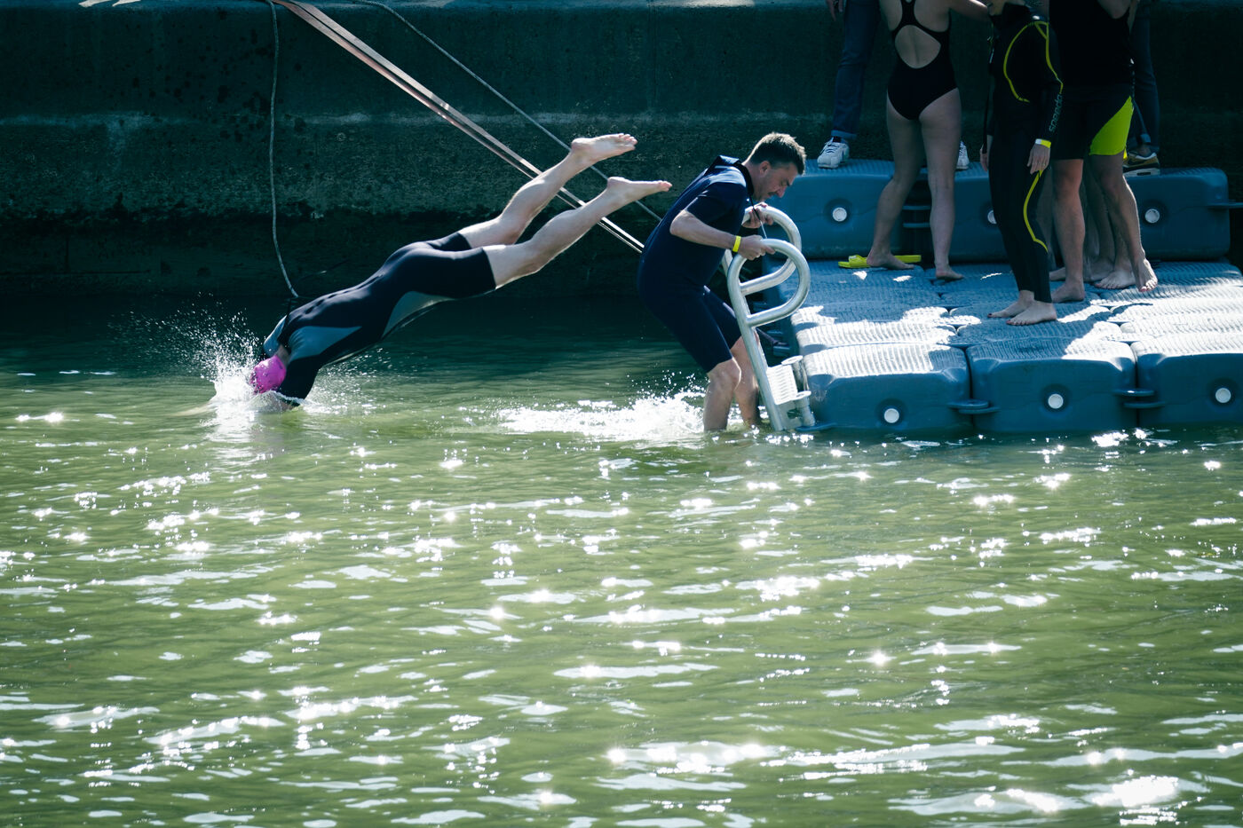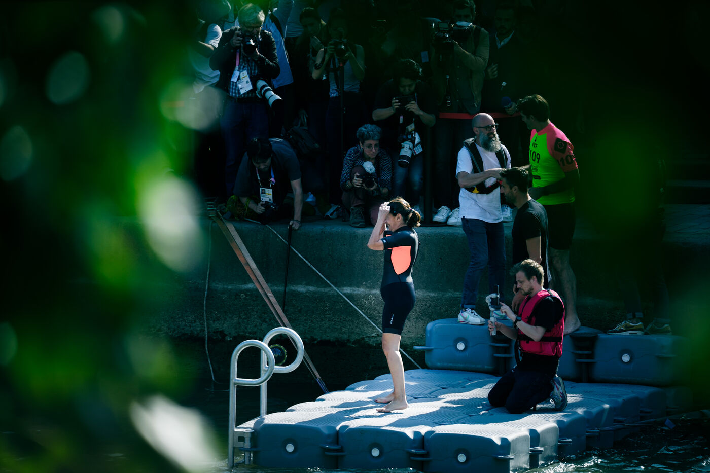 Baignade d Anna Hidalgo, maire de Paris et Tony Estanguet, president du comite d organisation dans la Seine avant des Jeux de Paris 2024 avant le Jeux Olympiques d ete de Paris 2024 a Paris, France, le 17 juillet 2024.