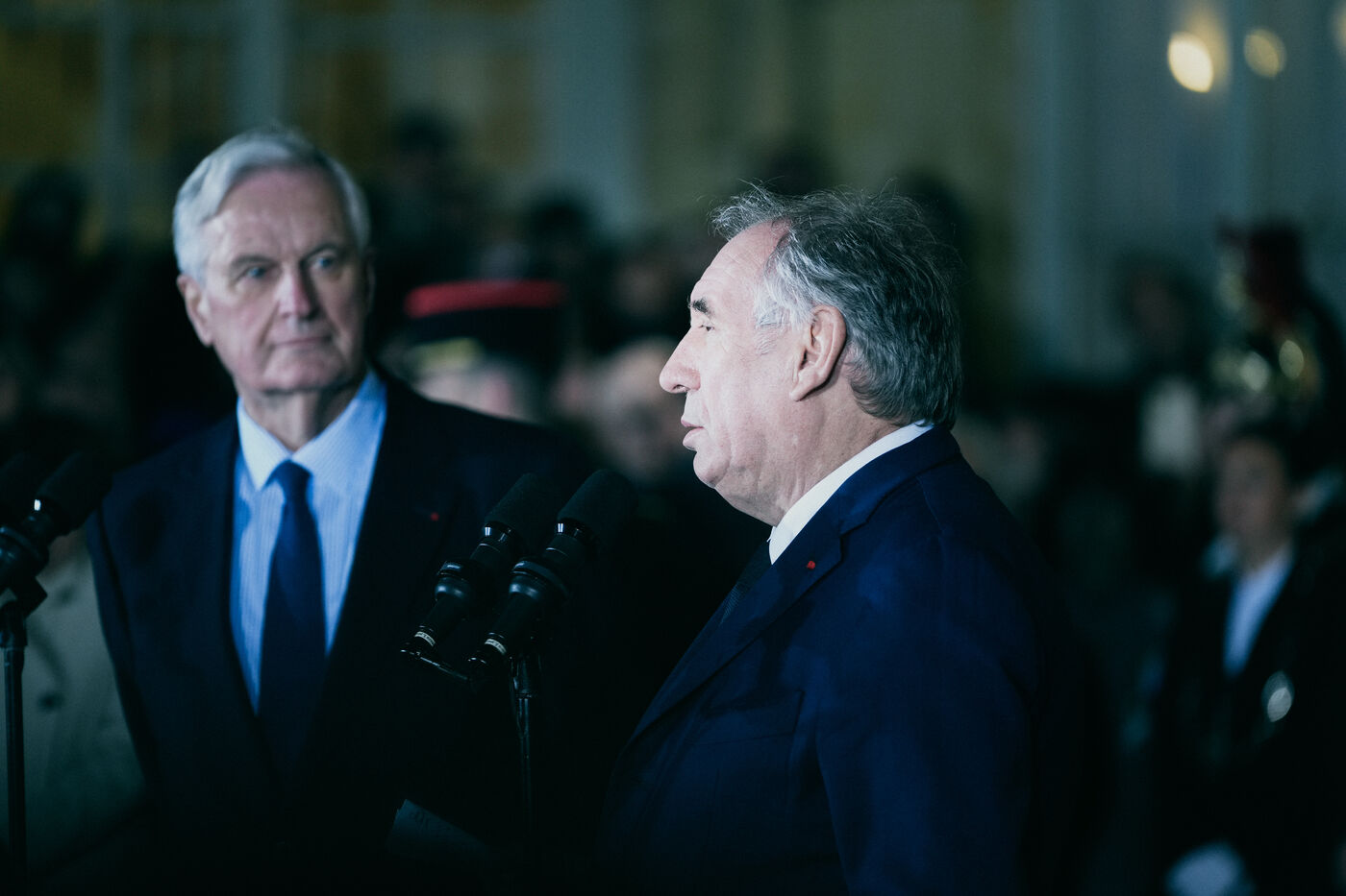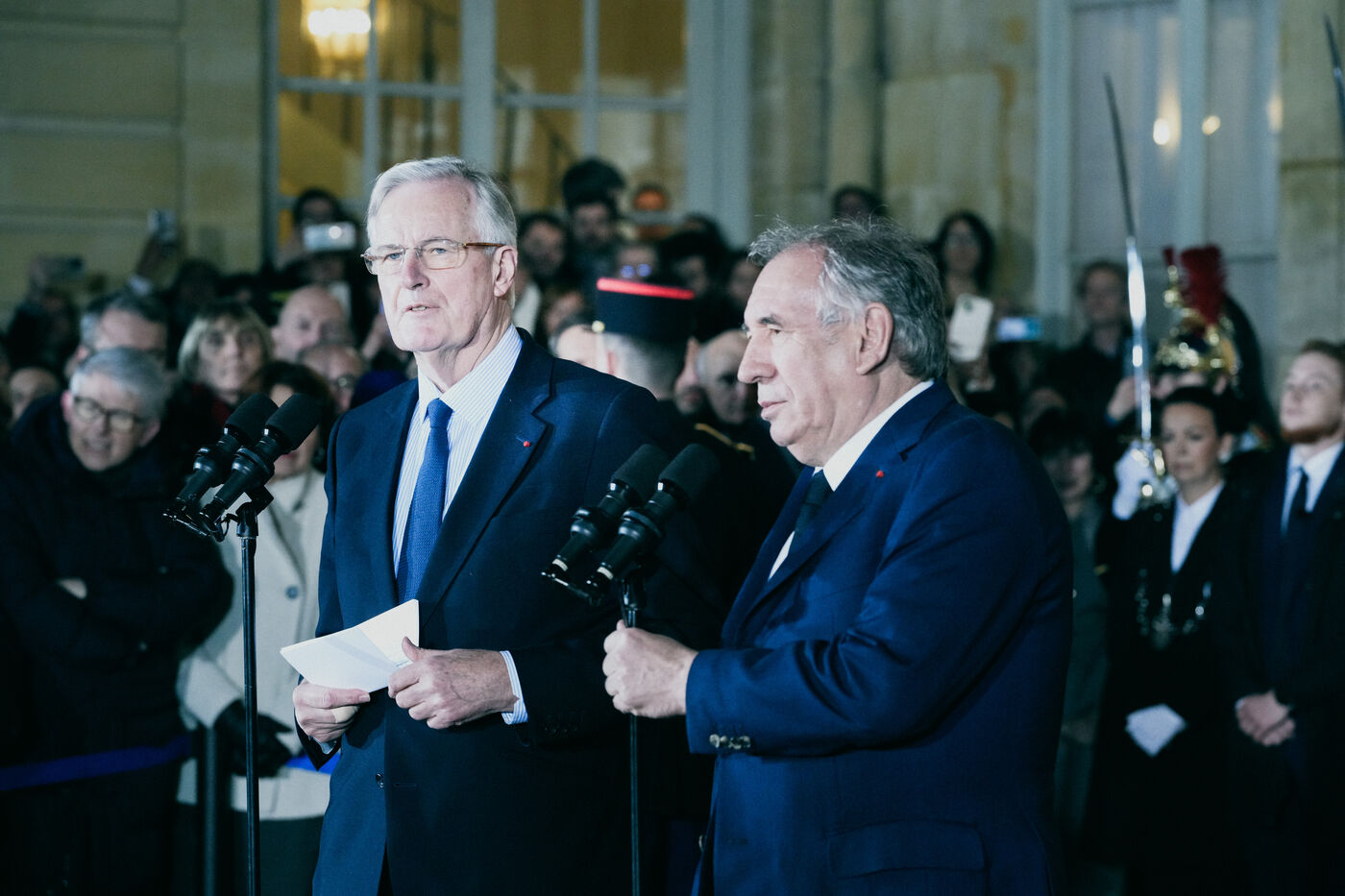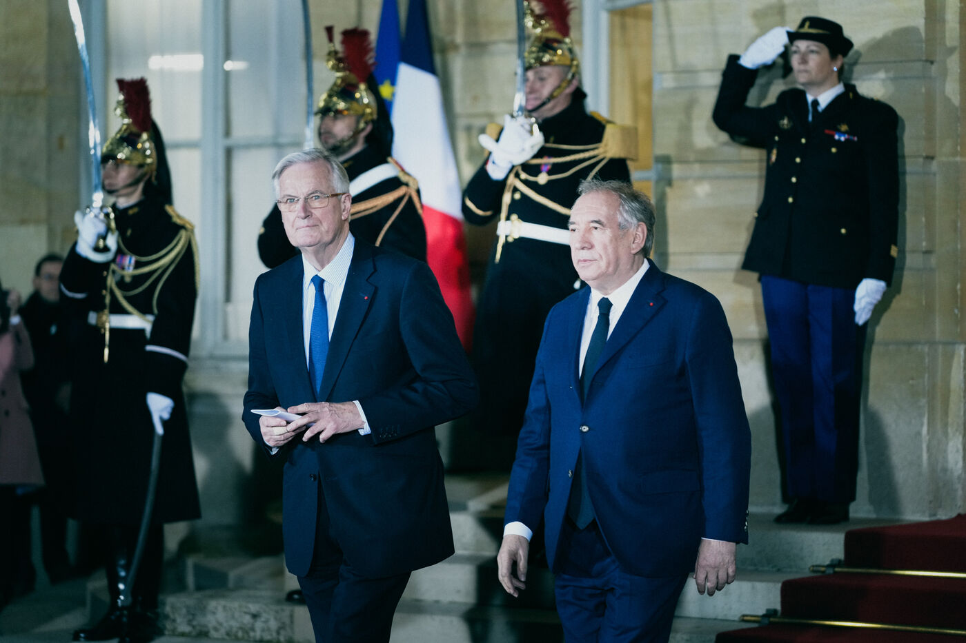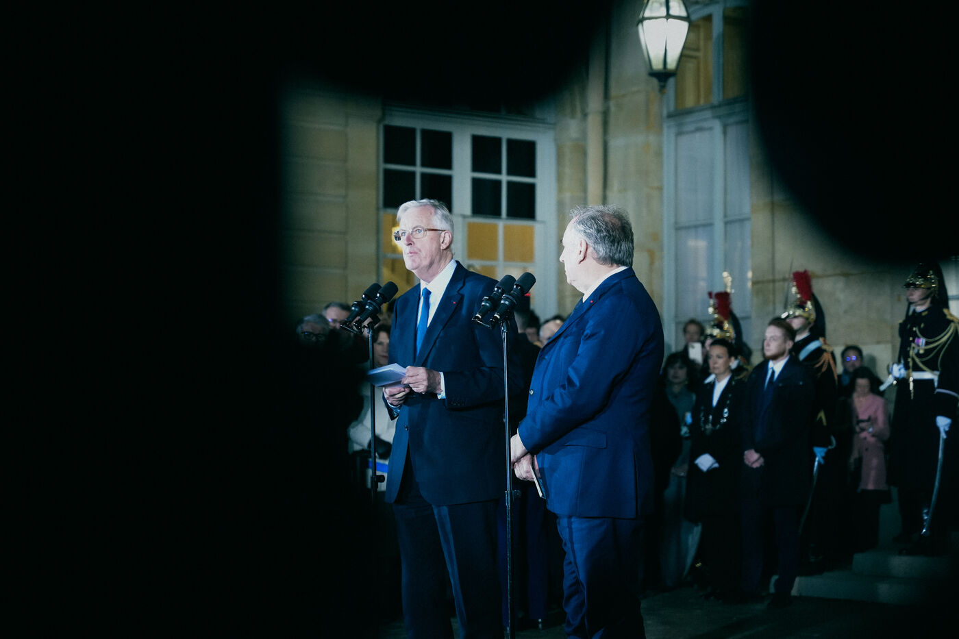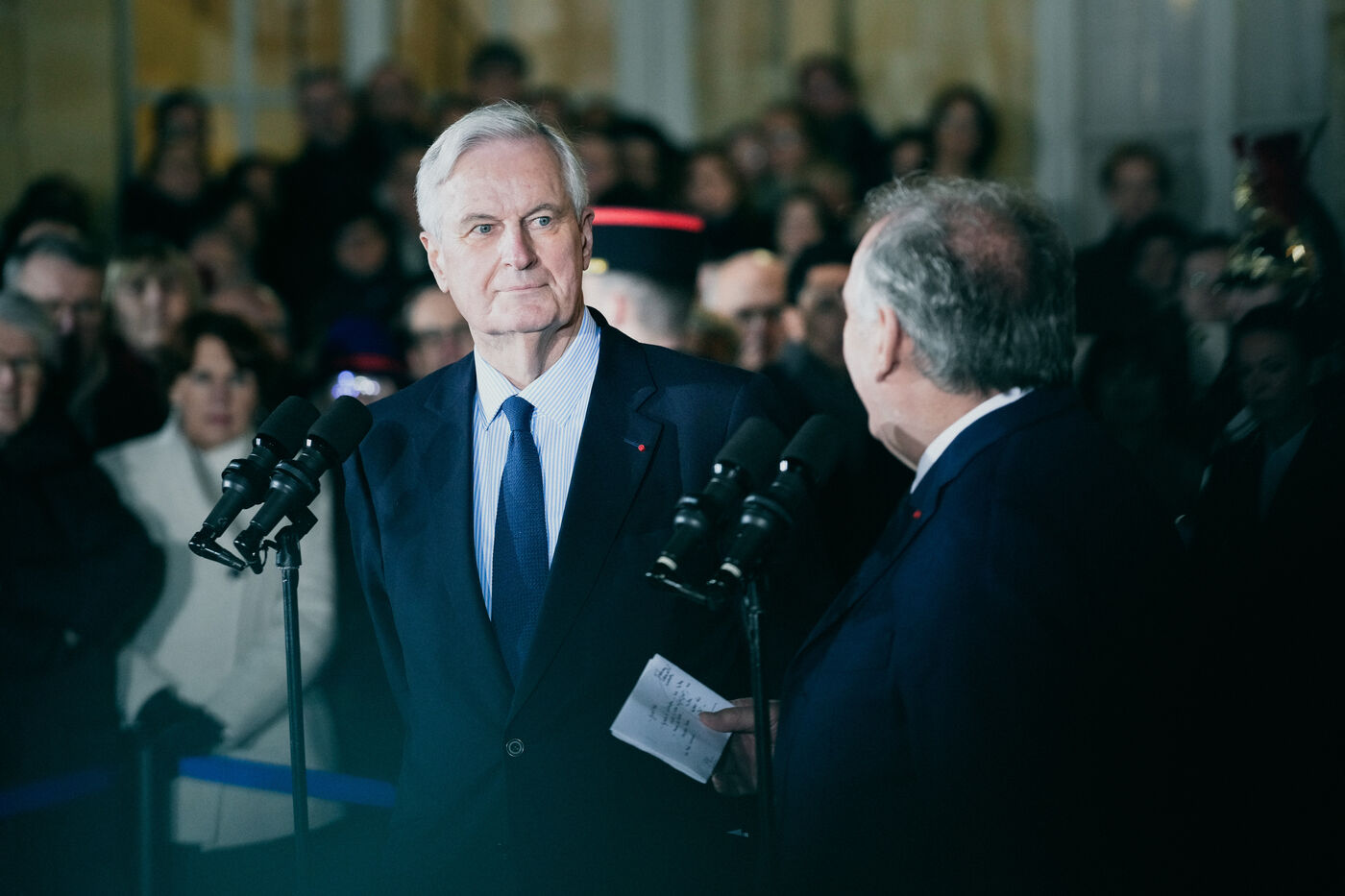 Handover of power between Michel Barnier former prime minister and Francois Bayrou prime minister at the Matignon Hotel in Paris France on December 13 2024.