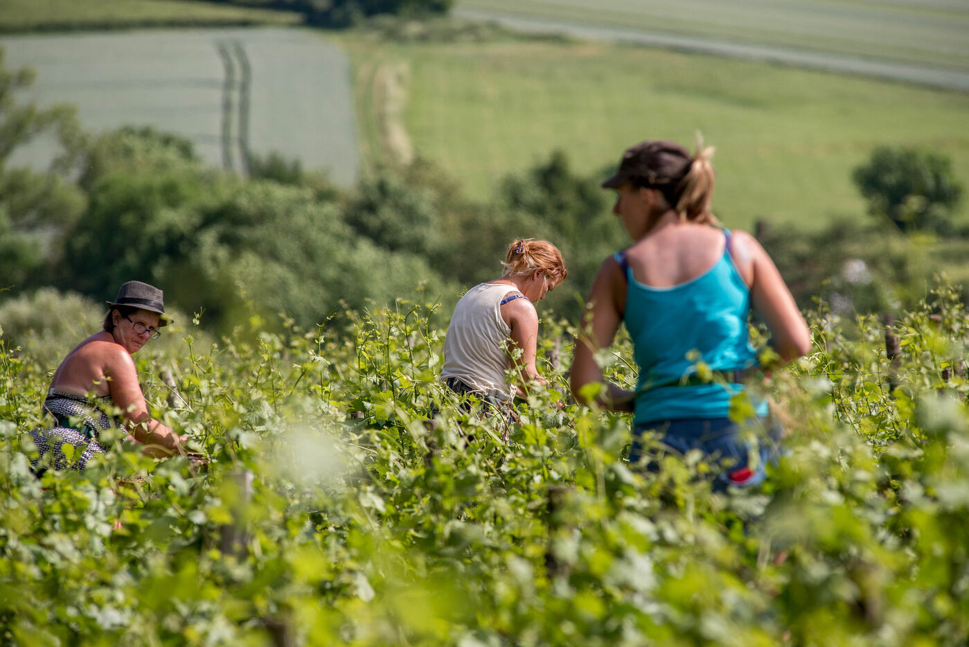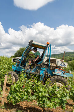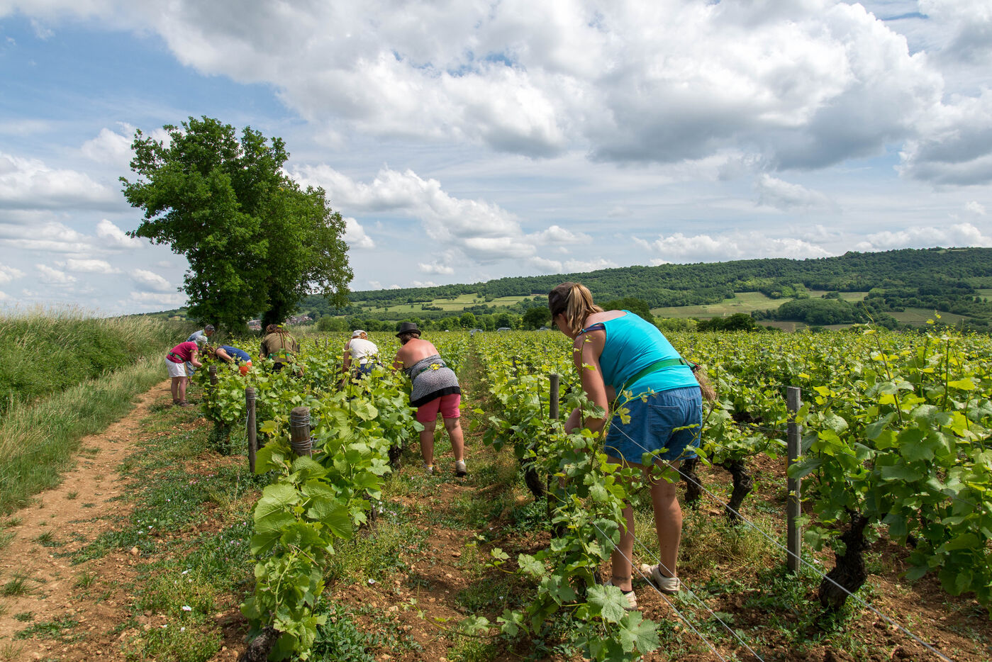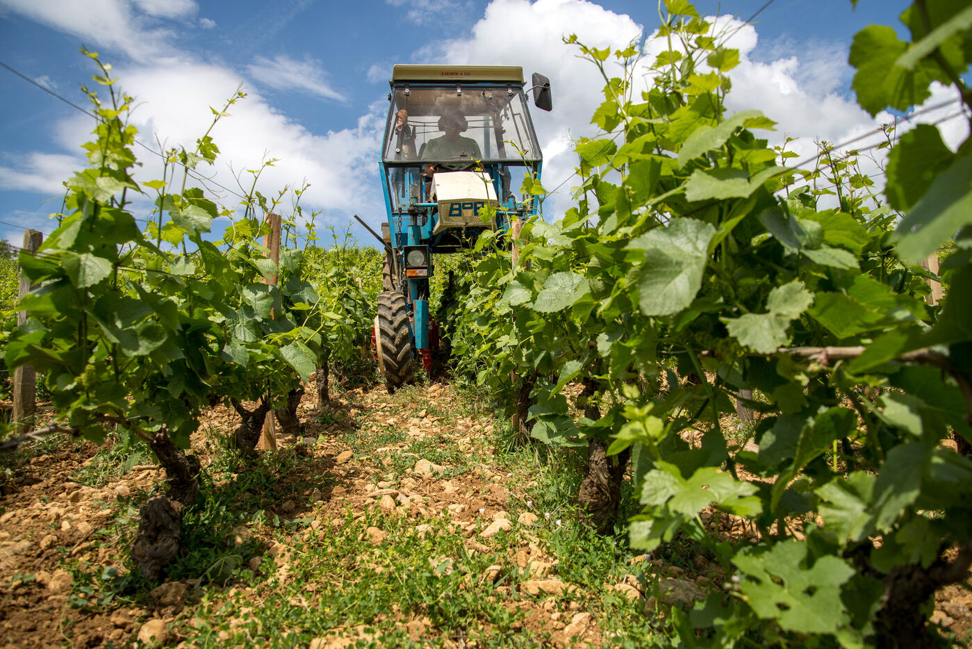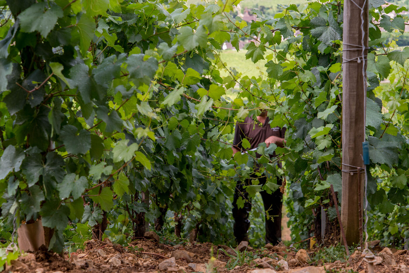 L’été ce sont les travaux en vert. Les grappes commencent à apparaître c’est la floraison. La végétation de la vigne a pris beaucoup d’ampleur, c’est le moment de couper toutes les feuilles qui empêchent le soleil de mûrir le raisin, c’est l’effeuillage. Le raisin commence à prendre sa couleur définitive c’est la véraison.