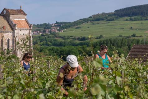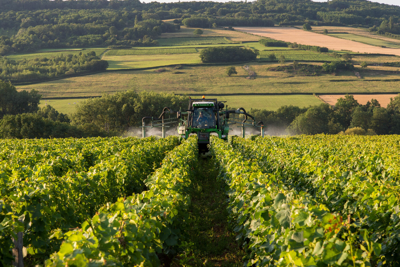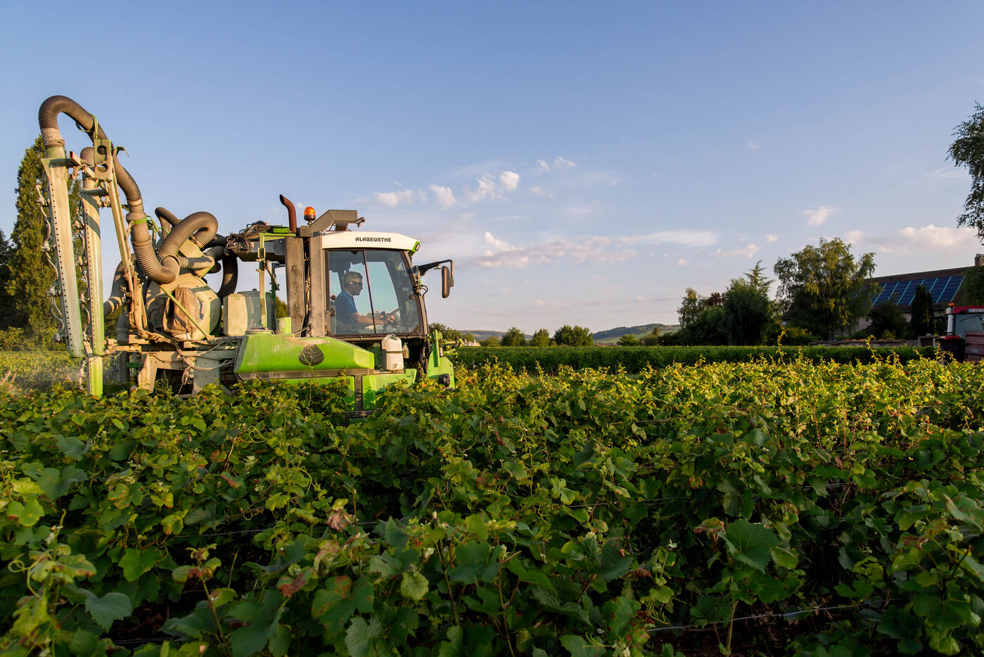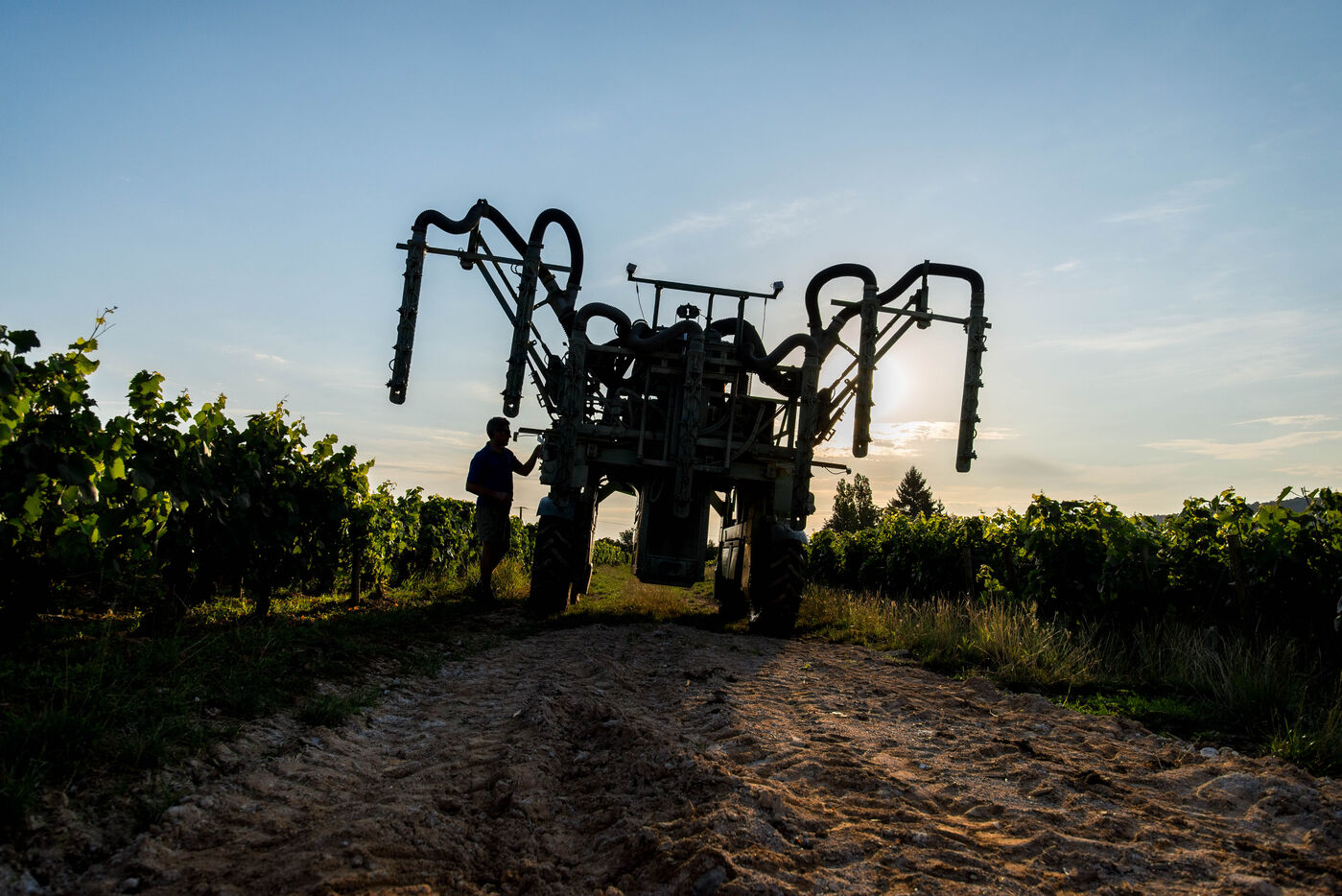 L’été ce sont les travaux en vert. Les grappes commencent à apparaître c’est la floraison. La végétation de la vigne a pris beaucoup d’ampleur, c’est le moment de couper toutes les feuilles qui empêchent le soleil de mûrir le raisin, c’est l’effeuillage. Le raisin commence à prendre sa couleur définitive c’est la véraison.