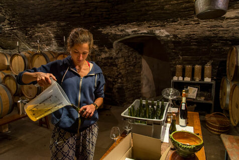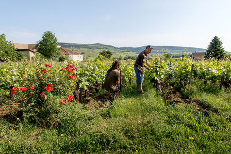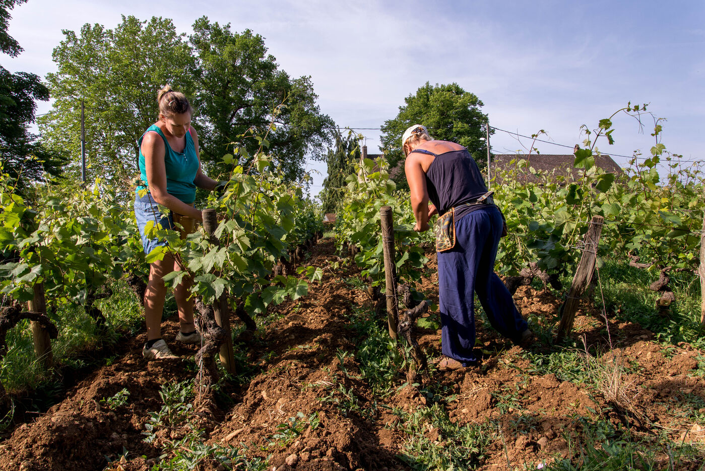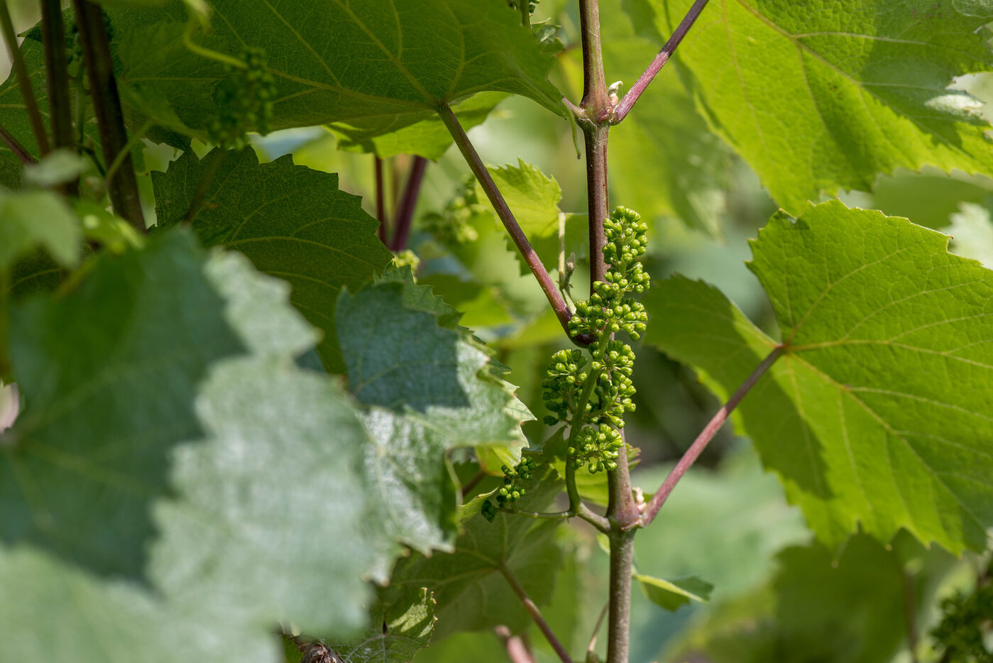Summer is the time for green work. The bunches of grapes start to appear - it's flowering time. The vine's vegetation has grown considerably, and it's time to cut back all the leaves that prevent the sun from ripening the grapes. The grapes begin to take on their final color - this is veraison.