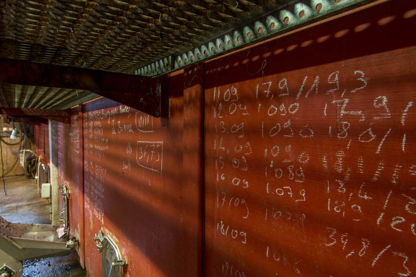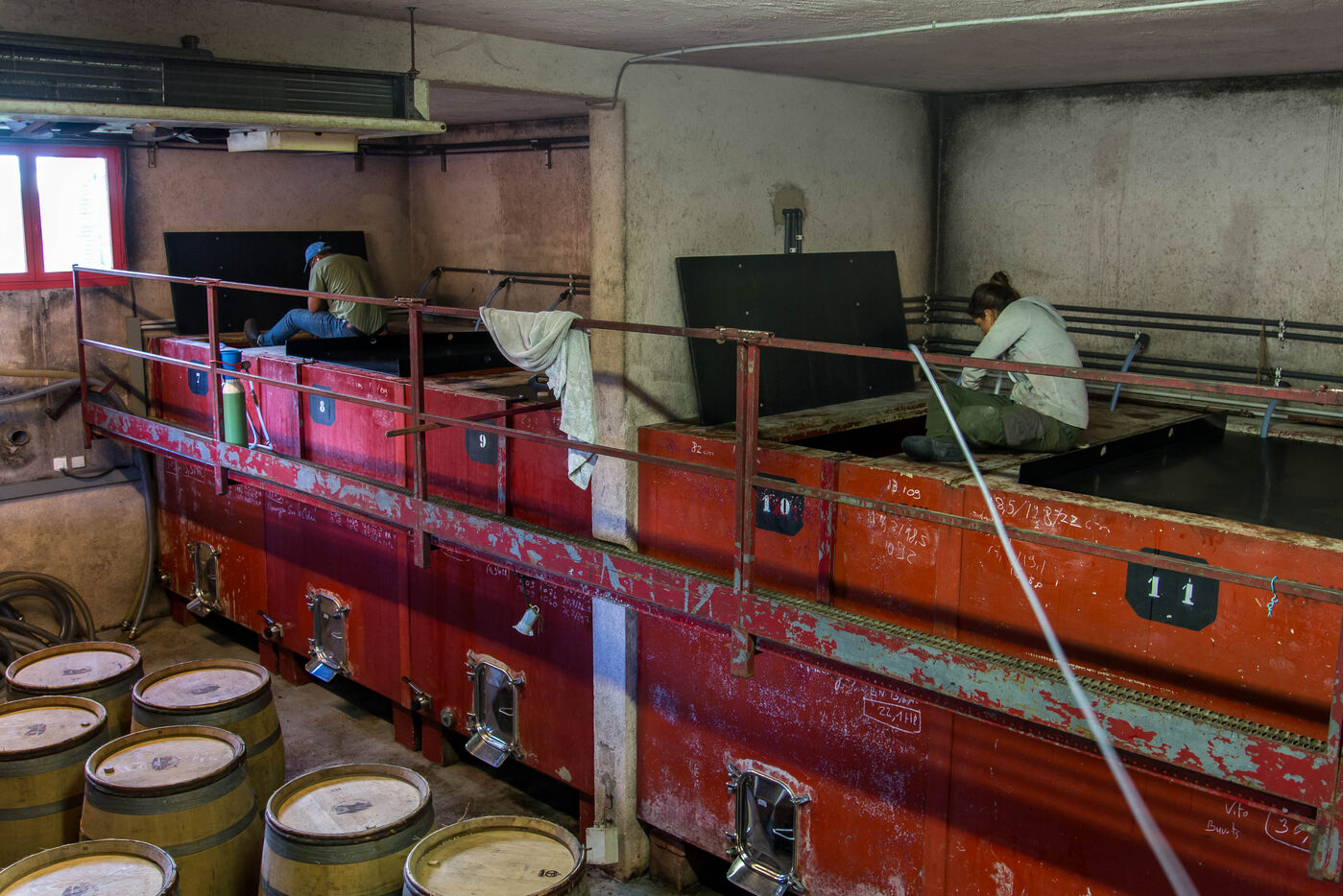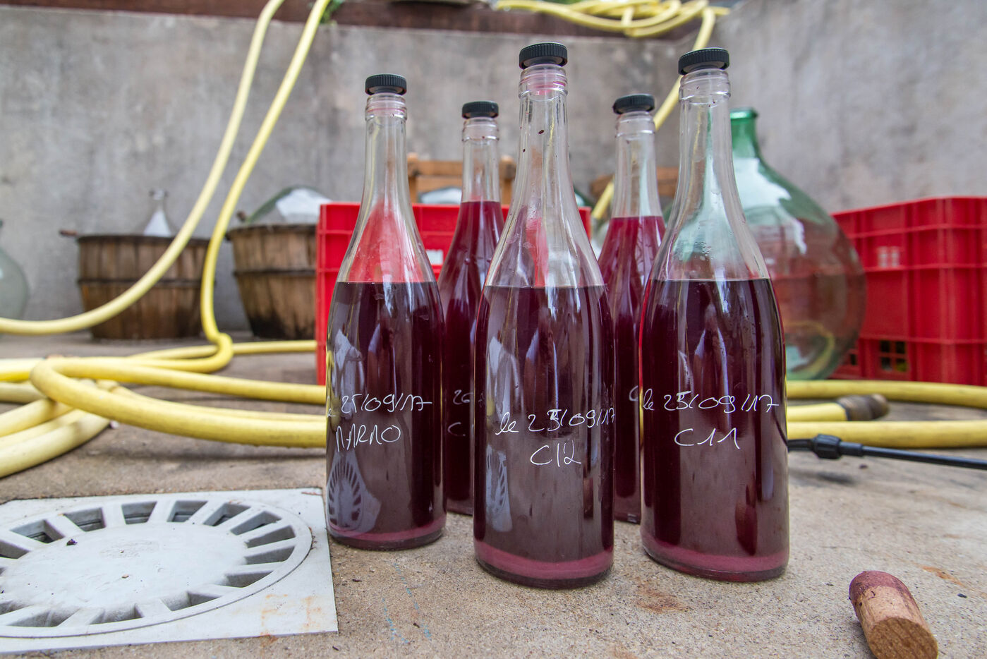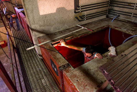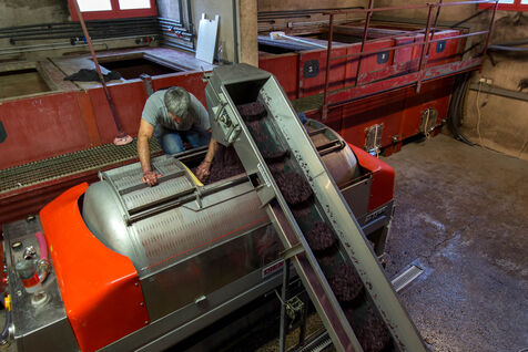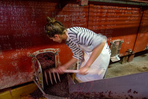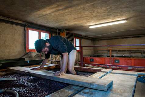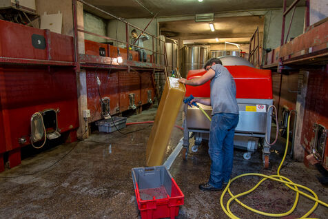 In the cuverie, the grapes are stored with their stalks, skins and seeds. The winemaker lets the grapes make their juice by pressing them with their feet - this is called pigeage, or punching down - to press down the cap of marc and protect it from oxidation. Several times a day, the winemaker monitors the winemaking process, measuring acidity and sugar levels, and especially the work of the indigenous yeasts. All this work is carried out according to the winemaker's choices, and the result he wishes to obtain. After several tastings, the winemaker decides to decant the wine and press it to obtain the final juice to suit his tastes.