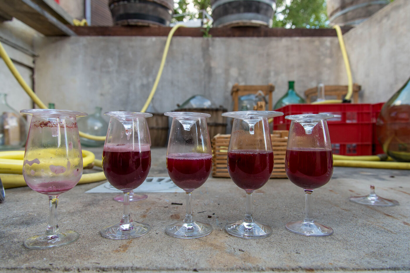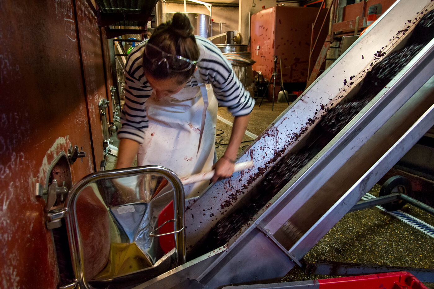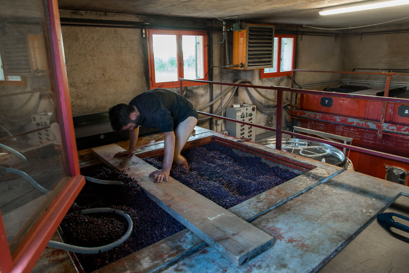 Dans la cuverie le raisin est avec ses rafles, la peau, les pépins. Le vigneron laisse le raisin faire sont jus en le pressant avec les pieds c’est le pigeage, ainsi il enfonce le chapeau de marc en le protégeant de l’oxydation. Le vigneron va suivre plusieurs fois par jour l’évolution de la vinification en mesurant l’acide et le sucre et surtout le travail des levures indigènes. Tout ce travail est fait en fonction des choix de vinification du viticulteur, et du résultat qu’il désire obtenir. Après plusieurs dégustations le vigneron décide de décuver le vin et le pressurer pour obtenir le jus définitif en fonction de ses goûts.