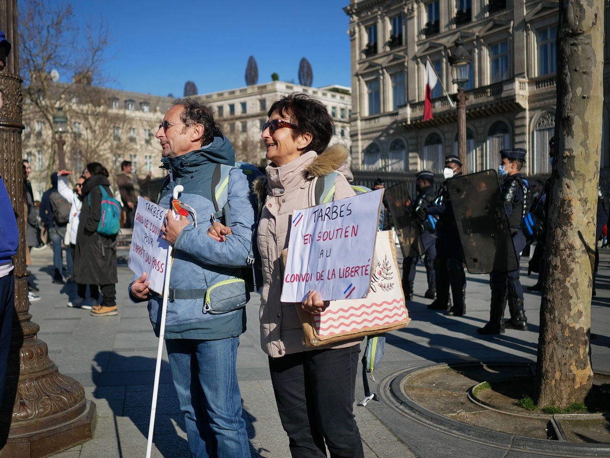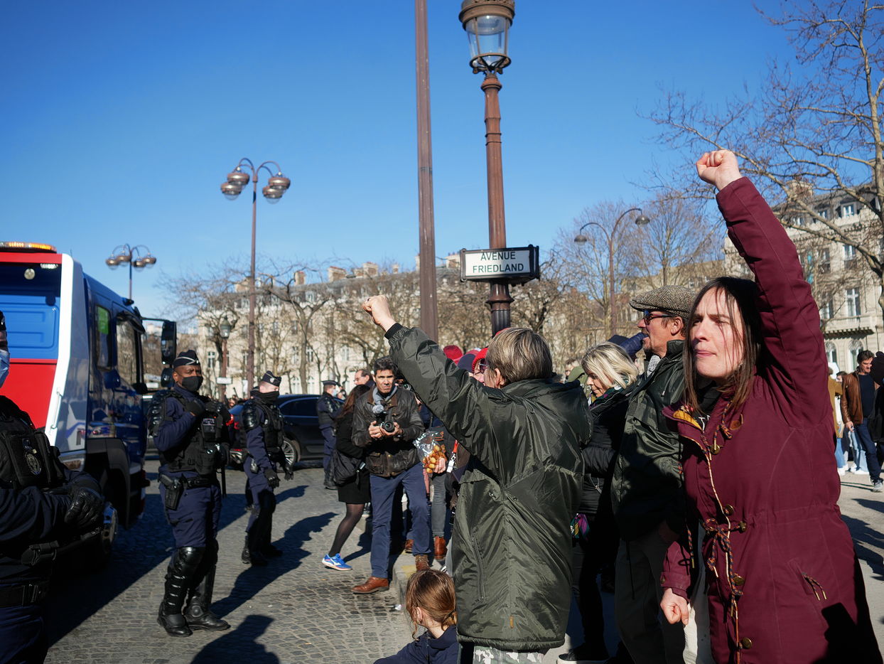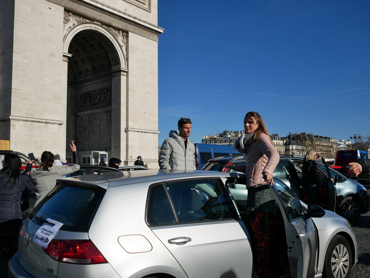 Des participants aux Convoi de la liberté à destination de Bruxelles manifeste Place de l'étoile pour plus d'égalité sociale et contre les atteintes aux libertés engendrées par le pass vaccinal.