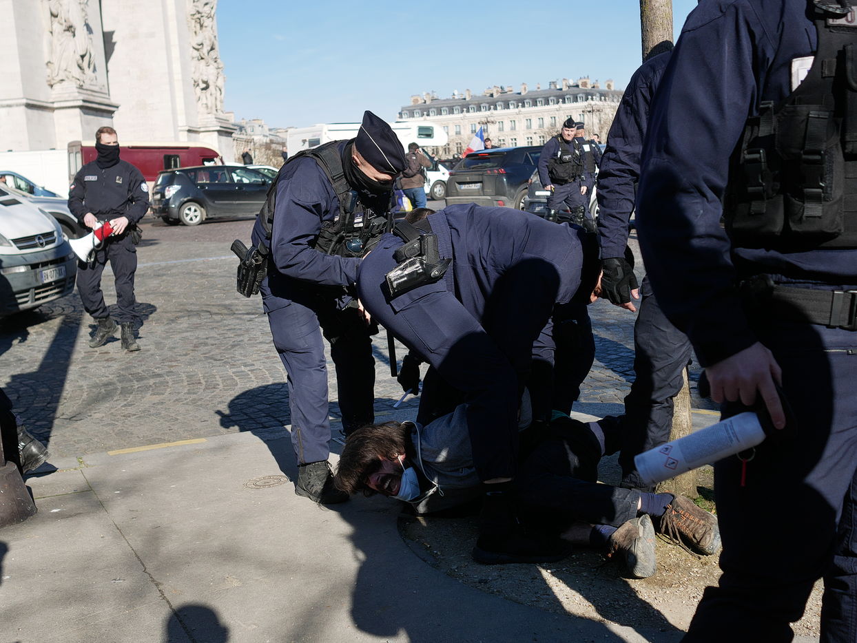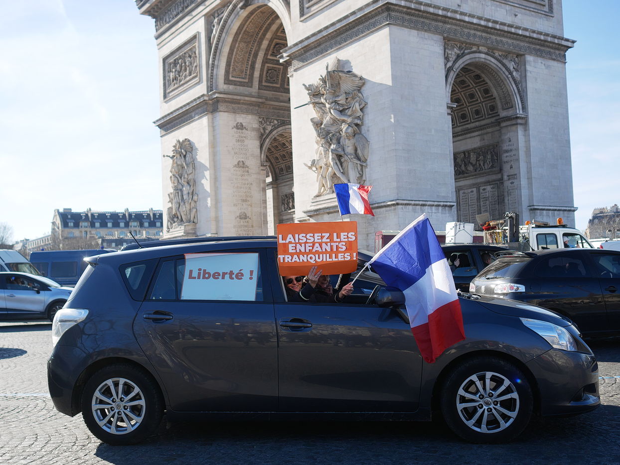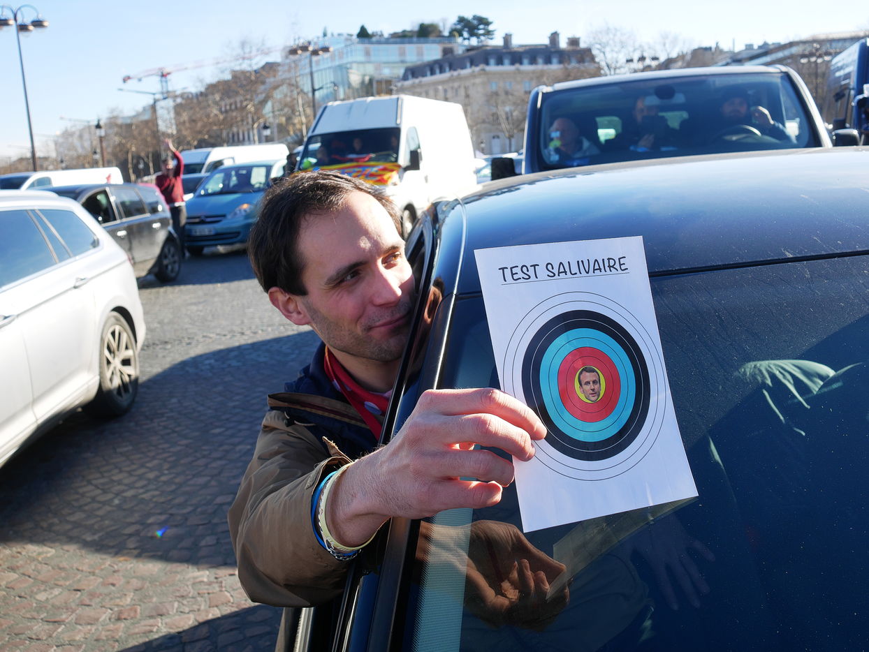 Des participants aux Convoi de la liberté à destination de Bruxelles manifeste Place de l'étoile pour plus d'égalité sociale et contre les atteintes aux libertés engendrées par le pass vaccinal.