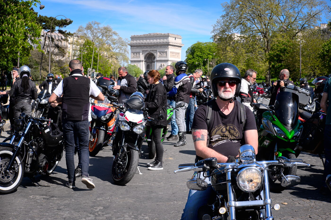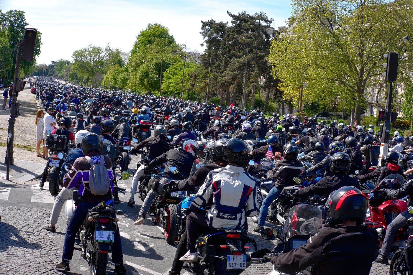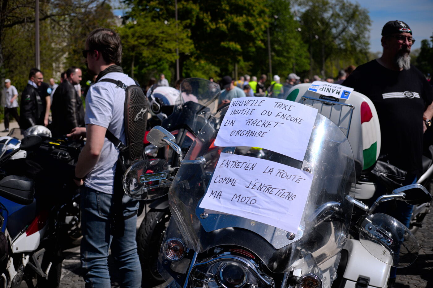 Demonstration against the introduction of compulsory roadworthiness tests for motorbikes, called by the Fédération française des motards en colère (French Federation of Angry Motorcyclists).