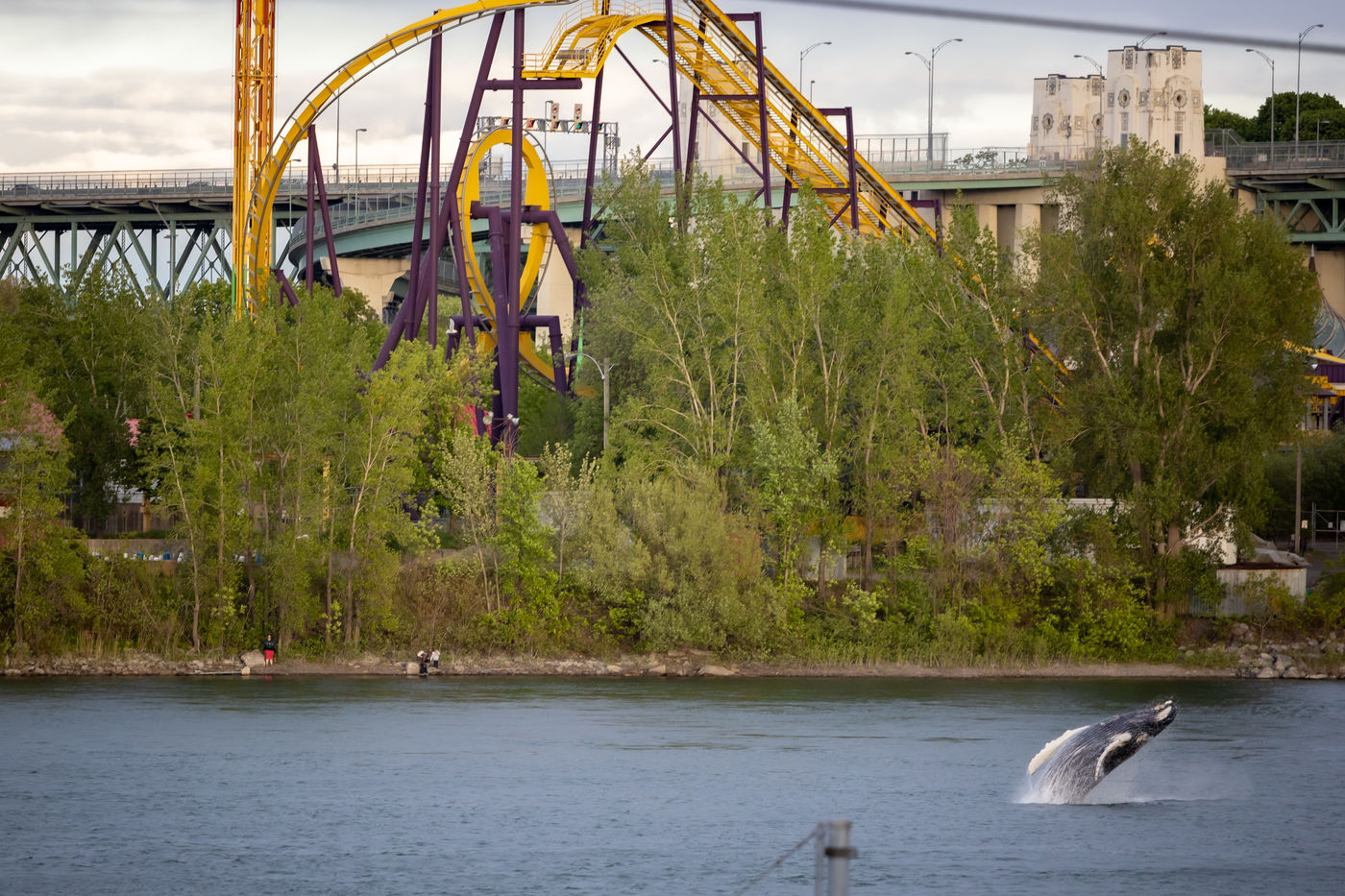 A humpback whale has strayed into the fresh waters of Montreal, near the Jacques Cartier Bridge, a situation never seen before for this humpback whale, which finds itself hundreds of kilometers from its natural environment. Montreal, Canada, May 31, 2020.