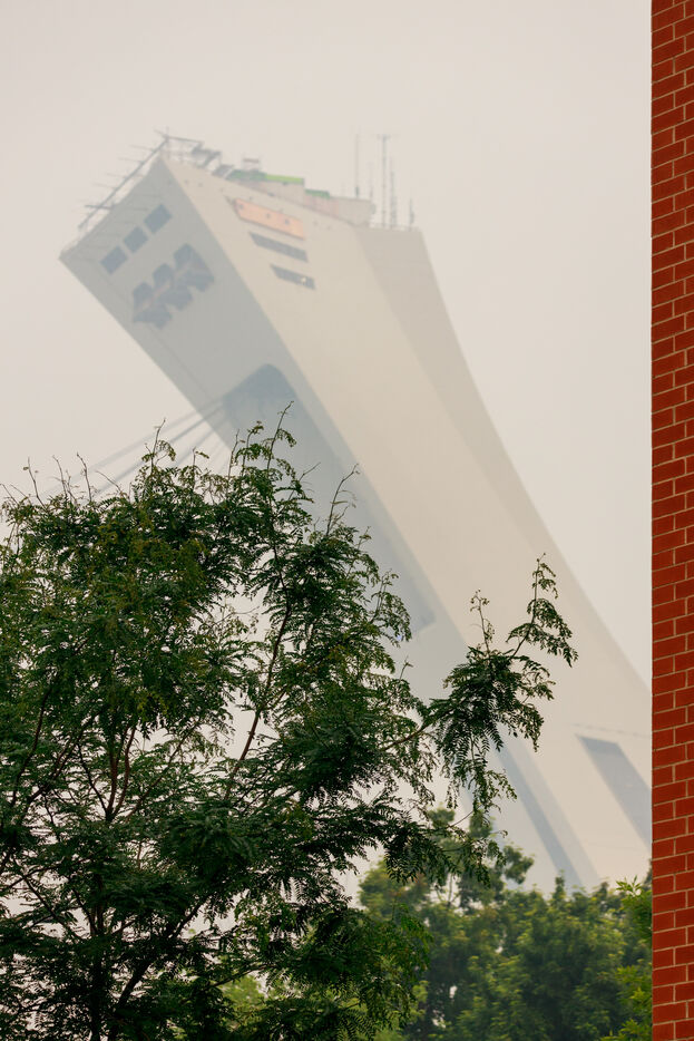A plusieurs centaines de km des brasiers, smog et forte odeur de fumee à Montreal, consequence des feux de forets qui font rage au Quebec. 25 juin 2023, Montreal, Qc, Canada.