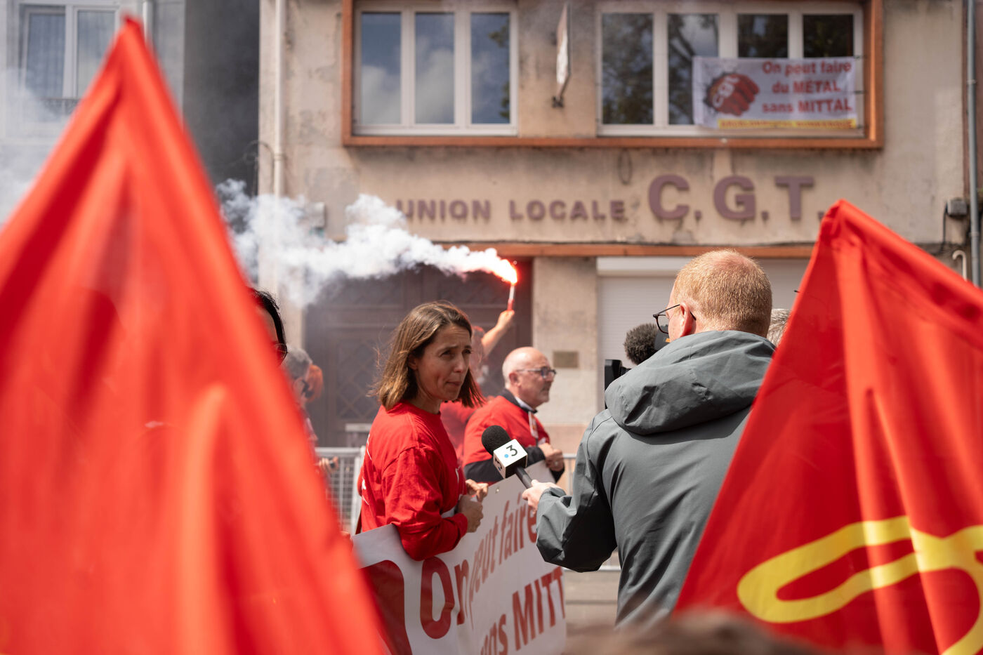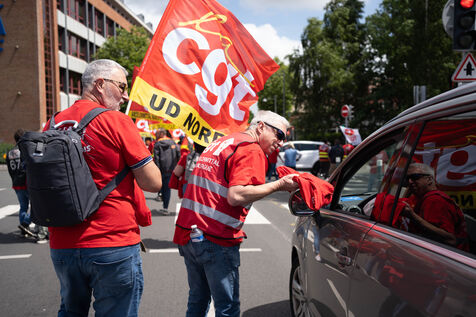 Demonstration by Arcelor Mittal employees in Dunkirk during stage 3 of the Tour de France. A popular and festive gathering organised by the CGT to defend jobs in the steel industry.