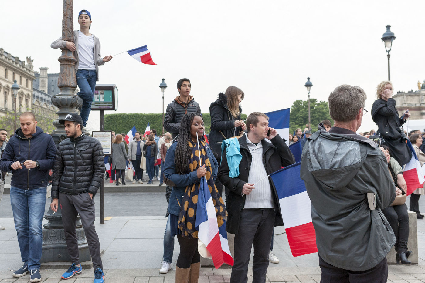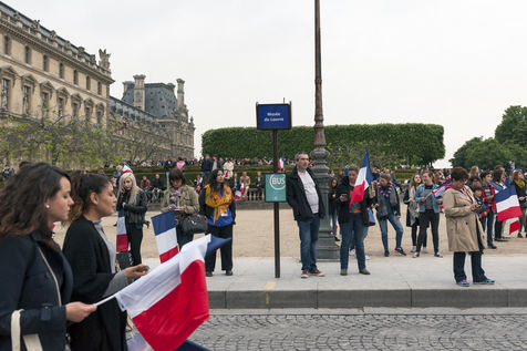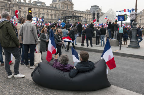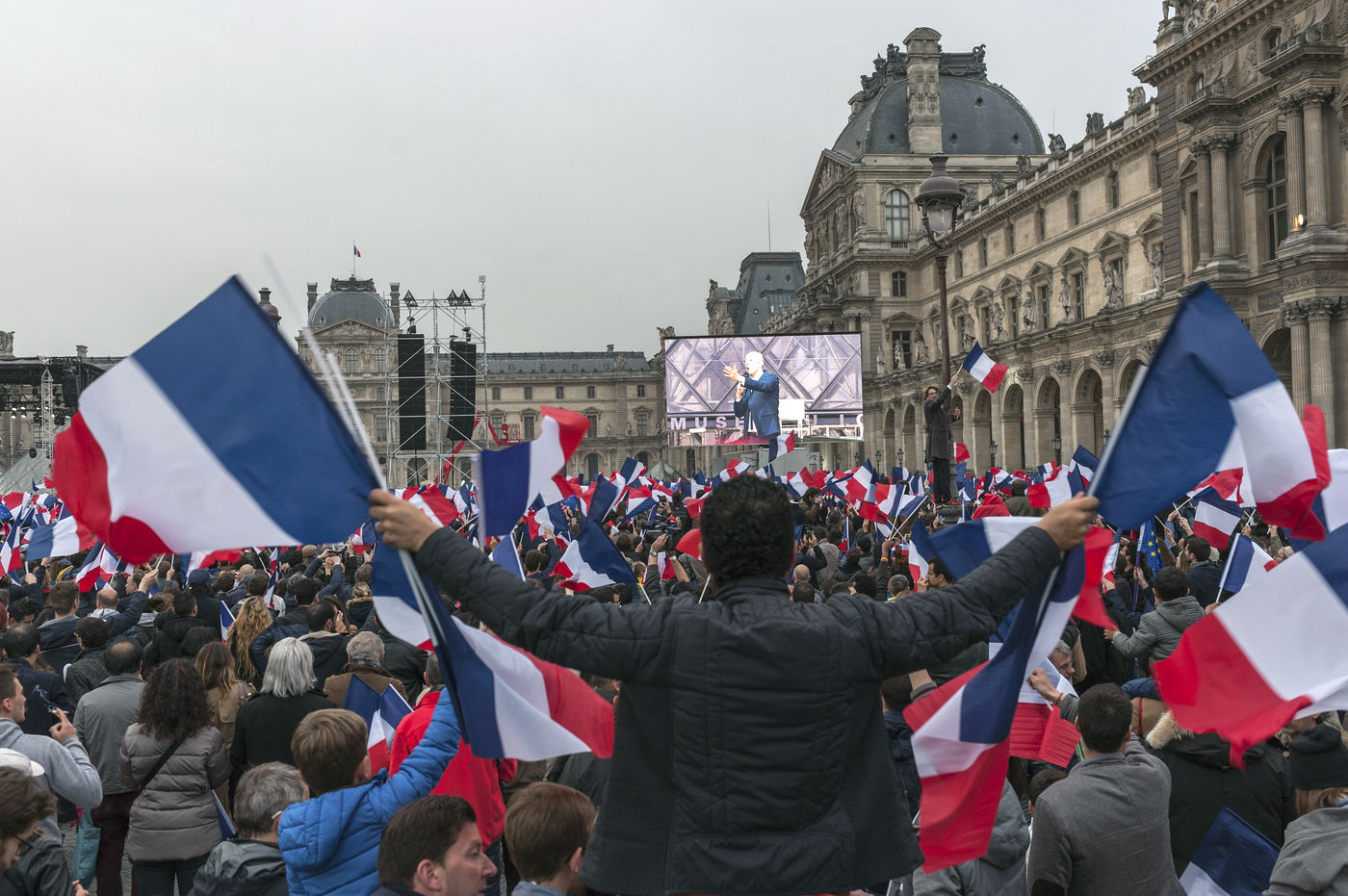 Atmosphere at Louvre Museum courtyard as elected president Emmanuel Macron comes and delivers a speech to his supporters - Paris, France.