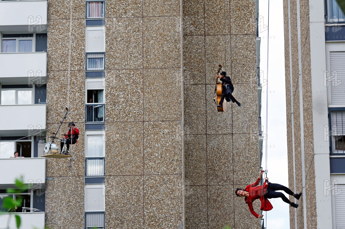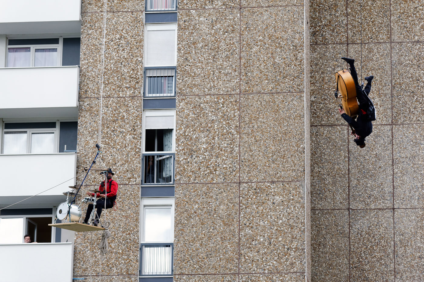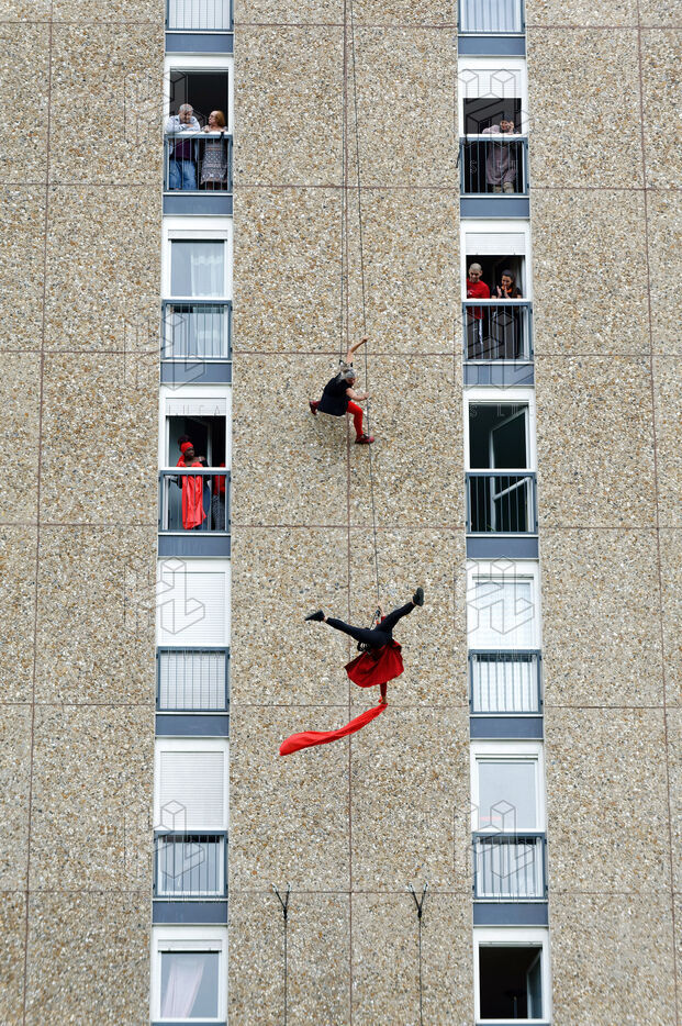 A poetic and spectacular show by the company Les Têtes Bêches on the facade of a 20-storey building in the Sentes district of Les Lilas, accompanied by live music. Born in 2013 in Marseille, the Compagnie Les Têtes Bêches specialises in all-terrain aerial acrobatics, mixing circus techniques, vertical dance, acrobatics and climbing. Their creations are strongly inspired by the location and are readapted for each performance.