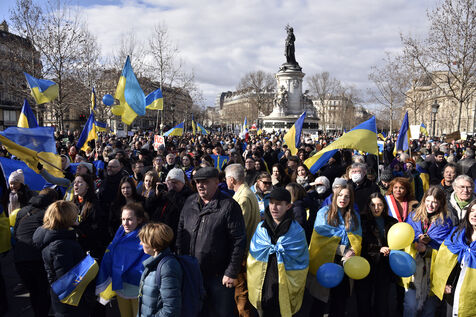 In the Place de la République in Paris, hundreds of participants sang the Ukrainian anthem in the early afternoon. Hands on hearts.