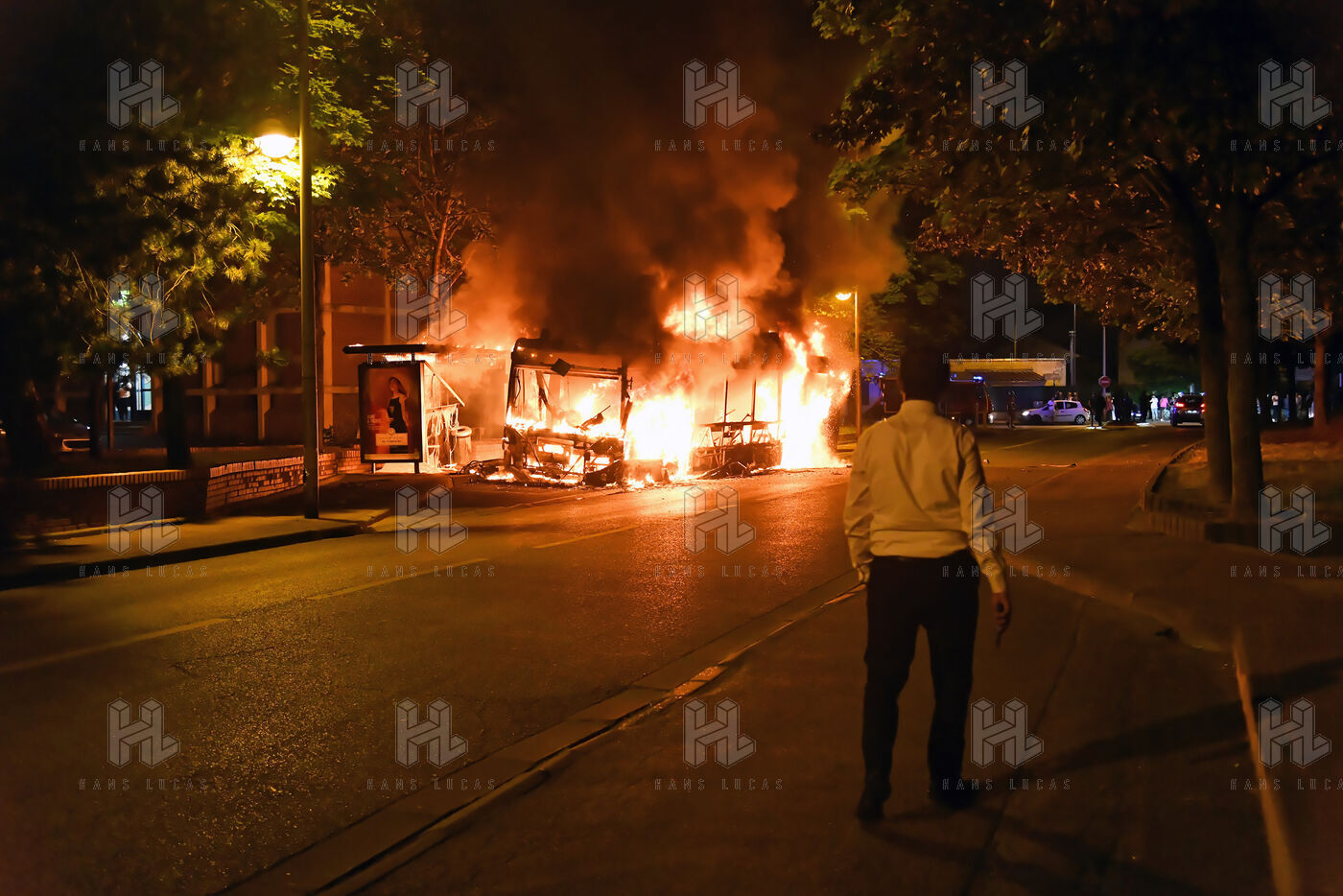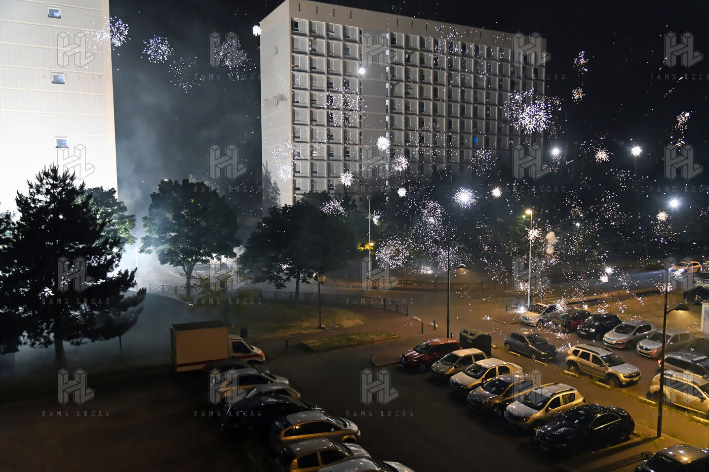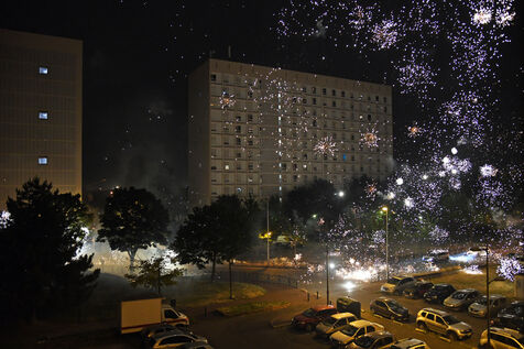 Une centaine de jeunes coagulé ont incendié un bus et ont utilisé de nombreux mortiers dans la cité. La police est intervenue très rapidement sur les lieux. Photographie de Dragan Lekic / Hans Lucas