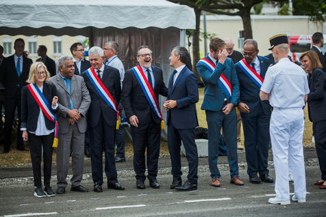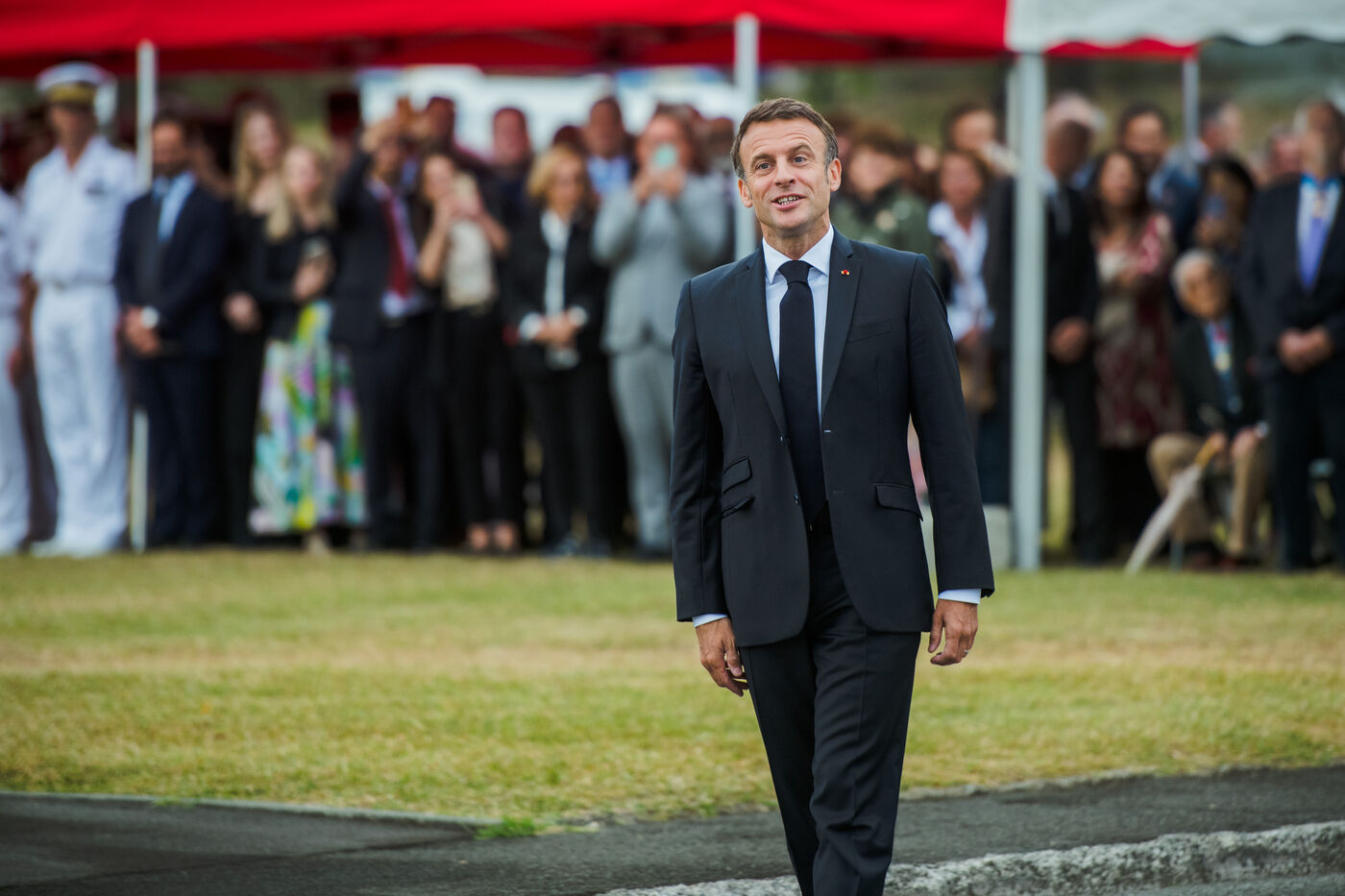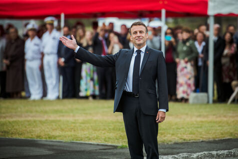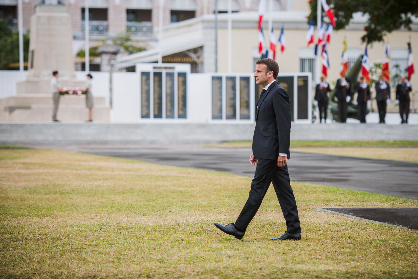 July 2023. The President of the French Republic, Emmanuel Macron, is on an official visit to New Caledonia. He takes part in the ceremony at Place Bir-Hakeim in Nouméa.