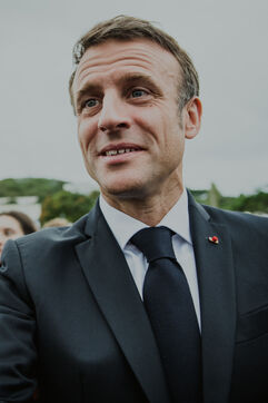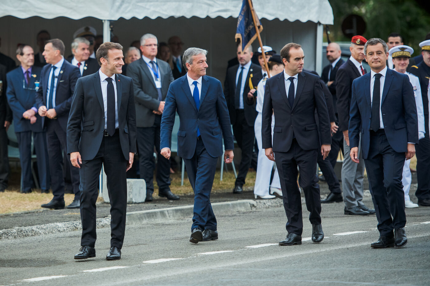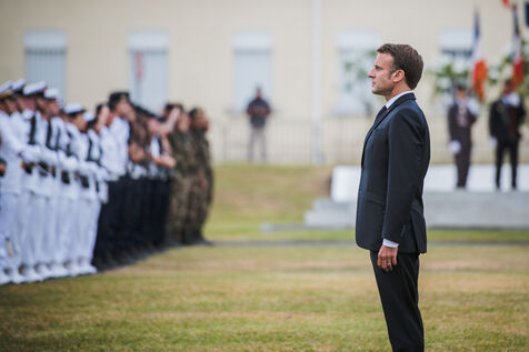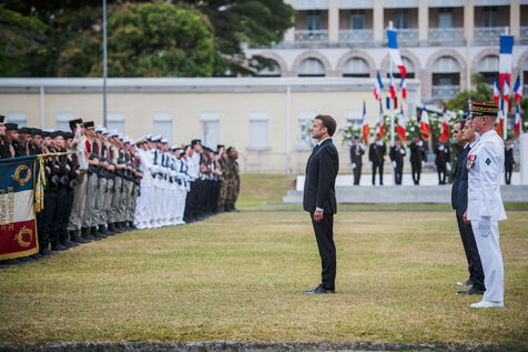 Juillet 2023. Le Président de la République française Emmanuel Macron est en visite officielle en Nouvelle-Calédonie. Il participe à la cérémonie de prise d'armes, place Bir-Hakeim, à Nouméa.