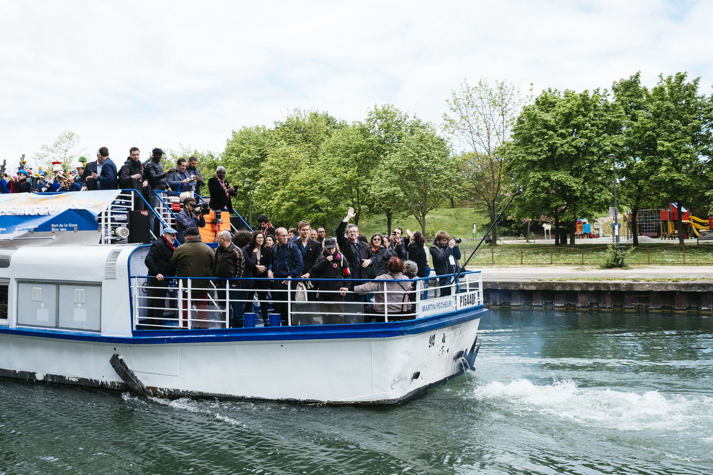 Jean-Luc Mélenchon en campagne à bord de la "Péniche insoumise", de Bobigny à la Bibliothèque François Mitterrand. Lundi 17 Avril 2017.