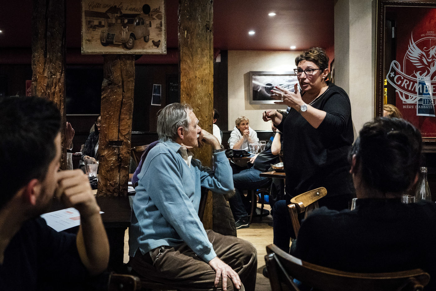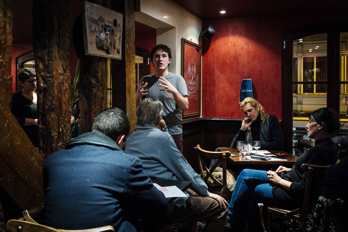 1ère réunion parisienne du grand débat national qui a réuni 45 citoyens au café Le Molière dans le quartier Saint-Germain des Prés, sur le sujet "Vote blanc et démocratie illisible" dans la thématique "La démocratie et la citoyenneté". Paris, 21 janvier 2019.