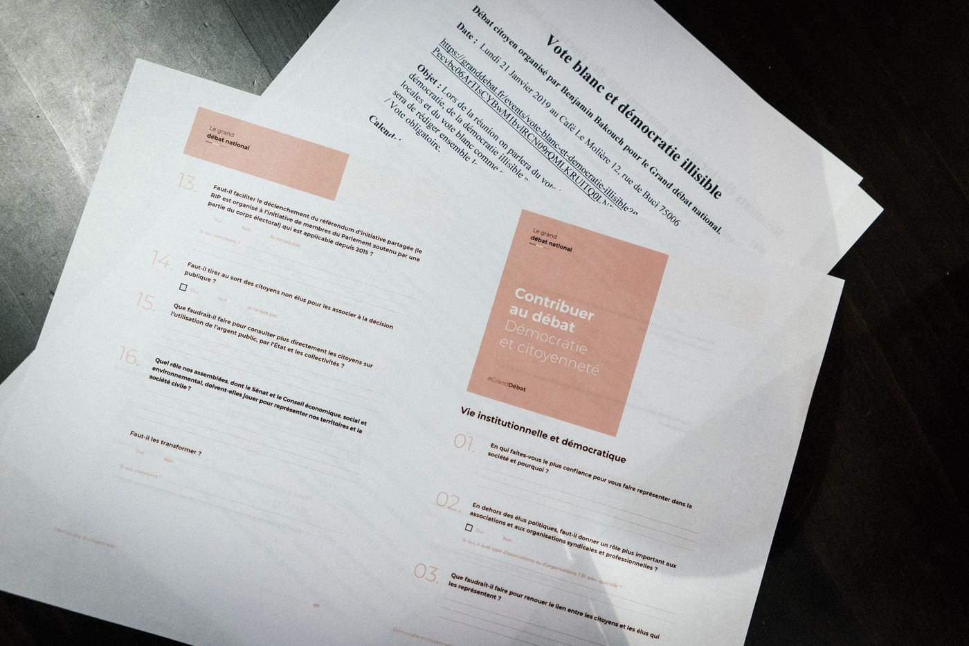 1st Parisian meeting of the major national debate which brought together 45 citizens at Café Le Molière in the Saint-Germain des Prés district, on the subject "White Vote and Unreadable Democracy" under the theme "Democracy and Citizenship". Paris, January 21, 2019