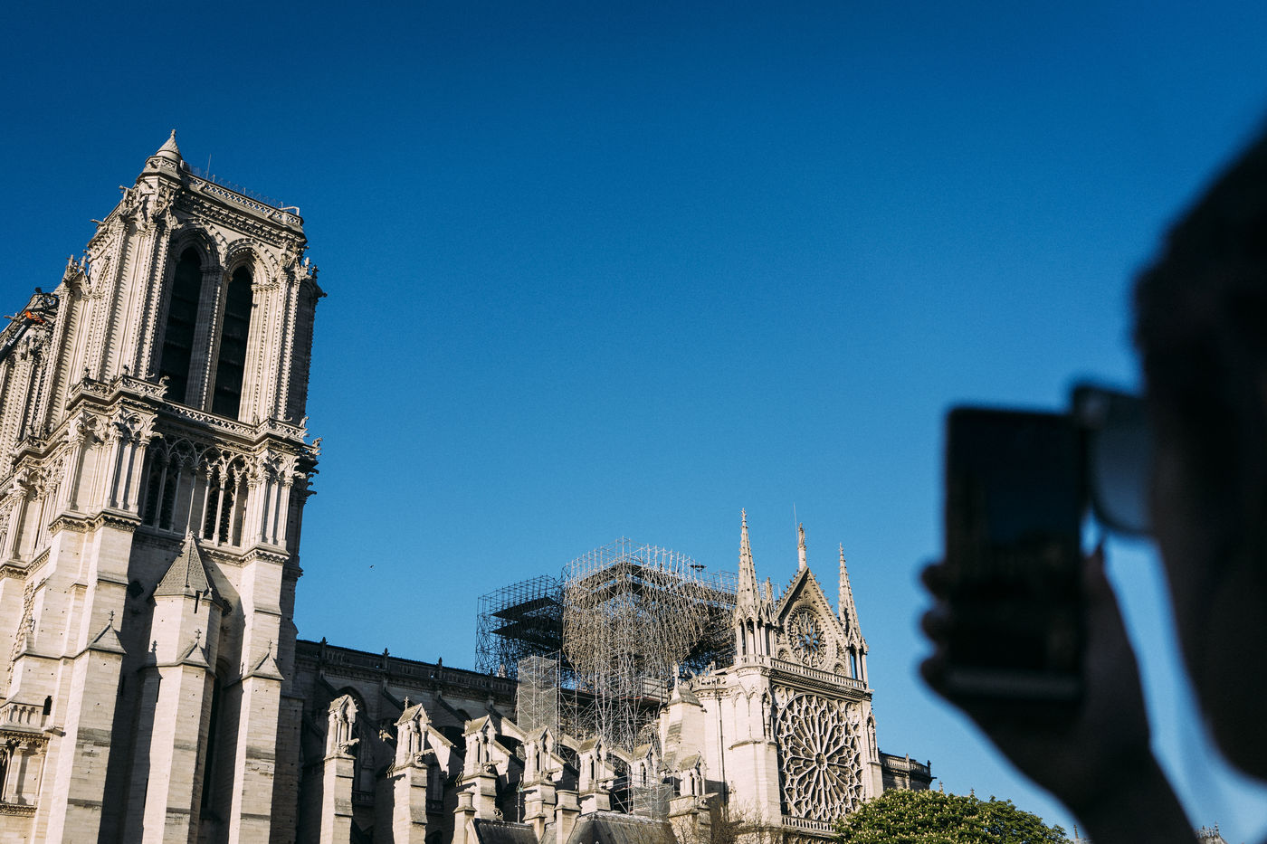 Le premier week-end après l'incendie qui a ravagé la cathédrale Notre-Dame de Paris, les touristes se pâment devant le monument historique et prennent des selfies. L'édifice est classé parmi les monuments les plus visités au monde avec plus de 12 millions de touristes par an. Paris, 20 avril 2019.