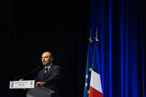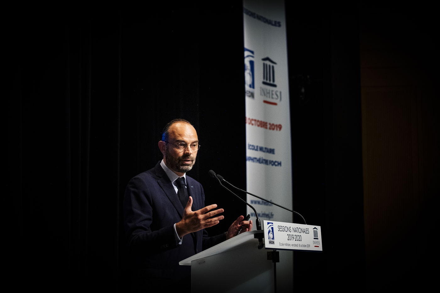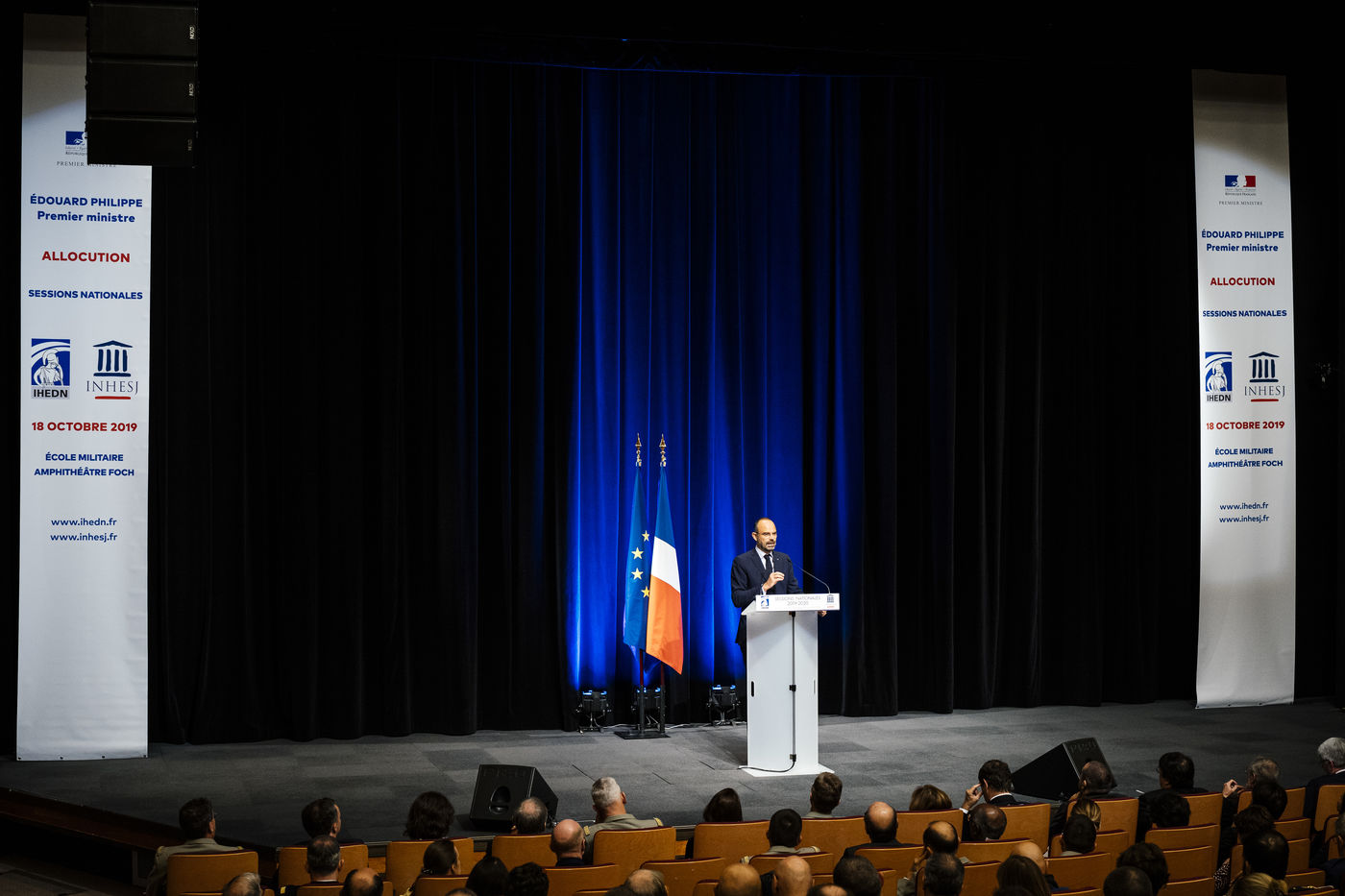 Mr. Édouard PHILIPPE, Prime Minister, with Mrs. Florence PARLY, Minister of the Armed Forces, and Mr. Laurent NUNEZ, Secretary of State to the Minister of the Interior. Speech before the 2019-2020 national sessions of the Institut des hautes études de Défense nationale (IHEDN) and the Institut national des hautes études de la Sécurité et de la Justice (INHESJ). Paris, École militaire, October 18, 2019.
