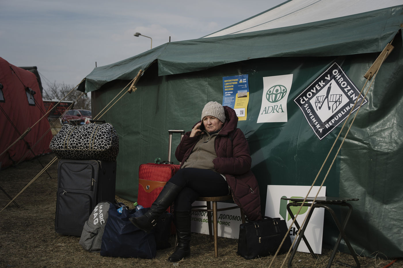 Russian invasion of Ukraine in 2022. Refugees are welcomed in a humanitarian camp at the border in Slovakia.
