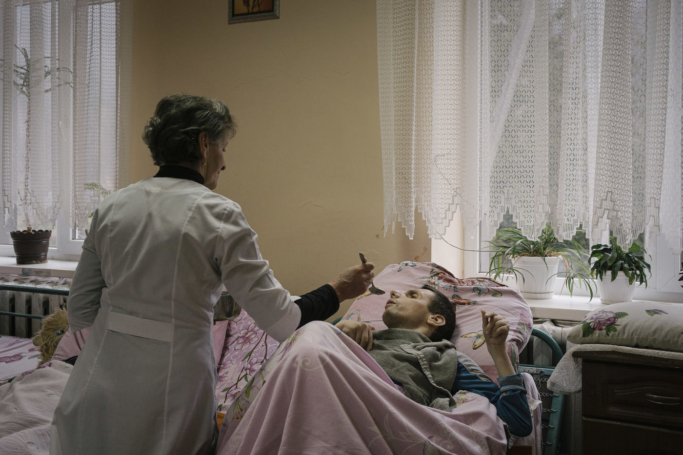 En Ukraine, depuis l'invasion russe, la guerre touche aussi les personnes handicapées placées en institution. Plusieurs ont dû être évacuées comme celles de Jytomyr et Kryvyi-Rih. Une quarantaine de jeunes gravement handicapés ont trouvé refuge dans l'orphelinat de Vilshany, localisé en Transcarpathie, une région jusque-là épargnée par le conflit. L'un des groupes est accompagné par deux membres du personnel de l'orphelinat volontaires, l'intendante et l'assistante sociale. Elles doivent dorénavant s'improviser aides soignantes. L'orphelinat de Vilshany, qui accueille en temps normal 170 enfants et jeune adultes gravement handicapés (catégorie IV) est soutenu depuis près de 30 ans par l'ONG Comité d'Aide Médicale. Longtemps orphelinat mouroir, il est aujourd'hui une institution modèle dans le pays. Le développement des personnes est favorisé notamment par la participation à de nombreux ateliers : enseignement, musique, création artistique, menuiserie...