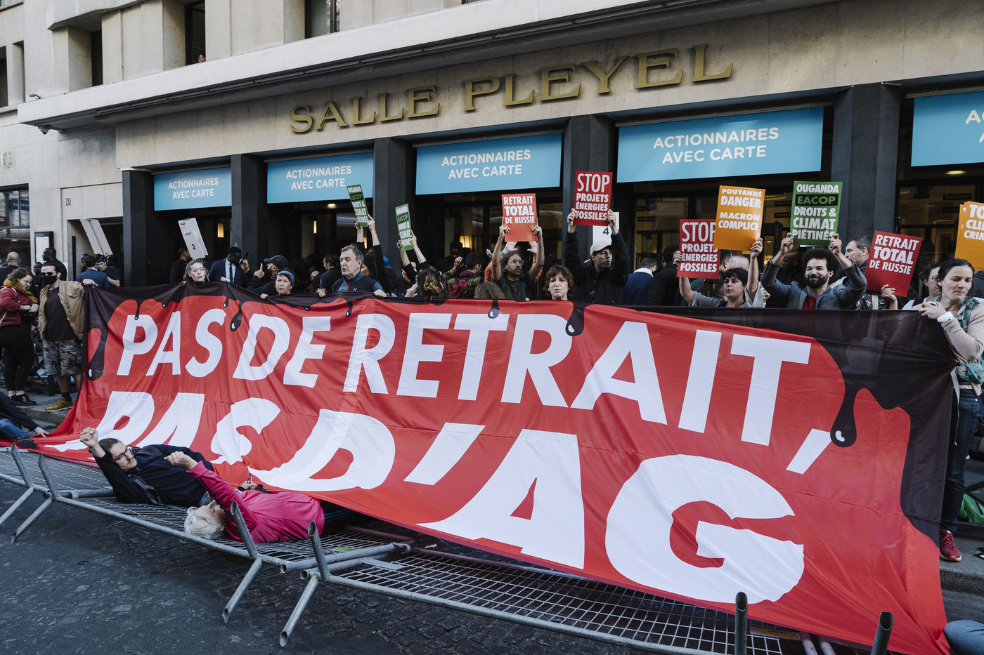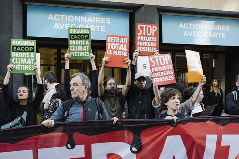 250 activistes du mouvement climat se sont mobilisé·es pour bloquer l'Assemblée Générale annuelle de Total, afin d?exiger de Patrick Pouyanné des engagements concrets et immédiats sur un retrait des activités de Total en Russie et cesser tout projet d'énergies fossiles.