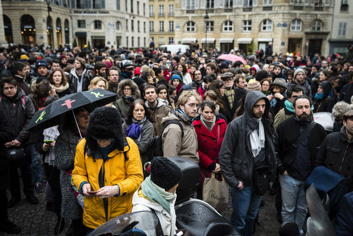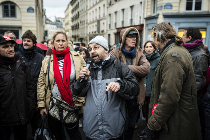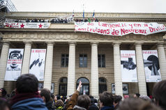 Occupation and mobilization of artists and technicians in the entertainment before the Odeon Theatre, the call of CGT Show. Paris, France, April 25, 2016.