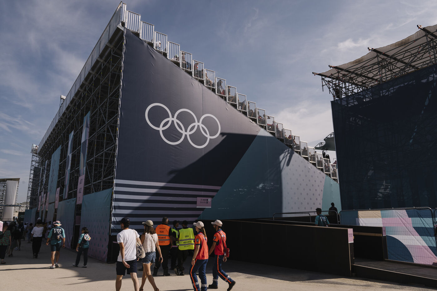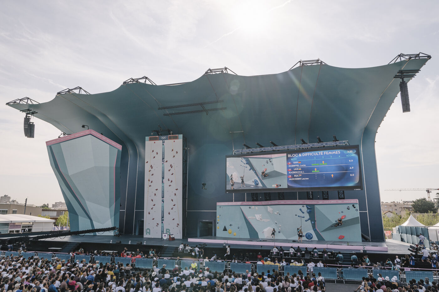 France, Le Bourget, 2024-08-06. Épreuve d'escalade sportive sur le site d'escalade du Bourget, supporters et infrastructure du quartier olympique, dans le cadre des Jeux Olympiques Paris 2024.