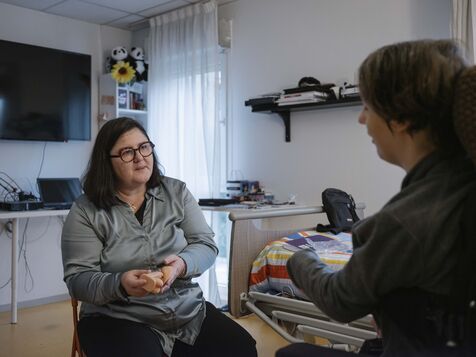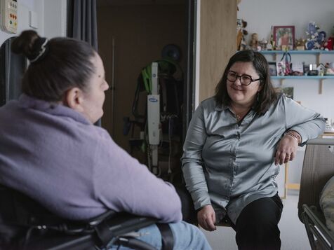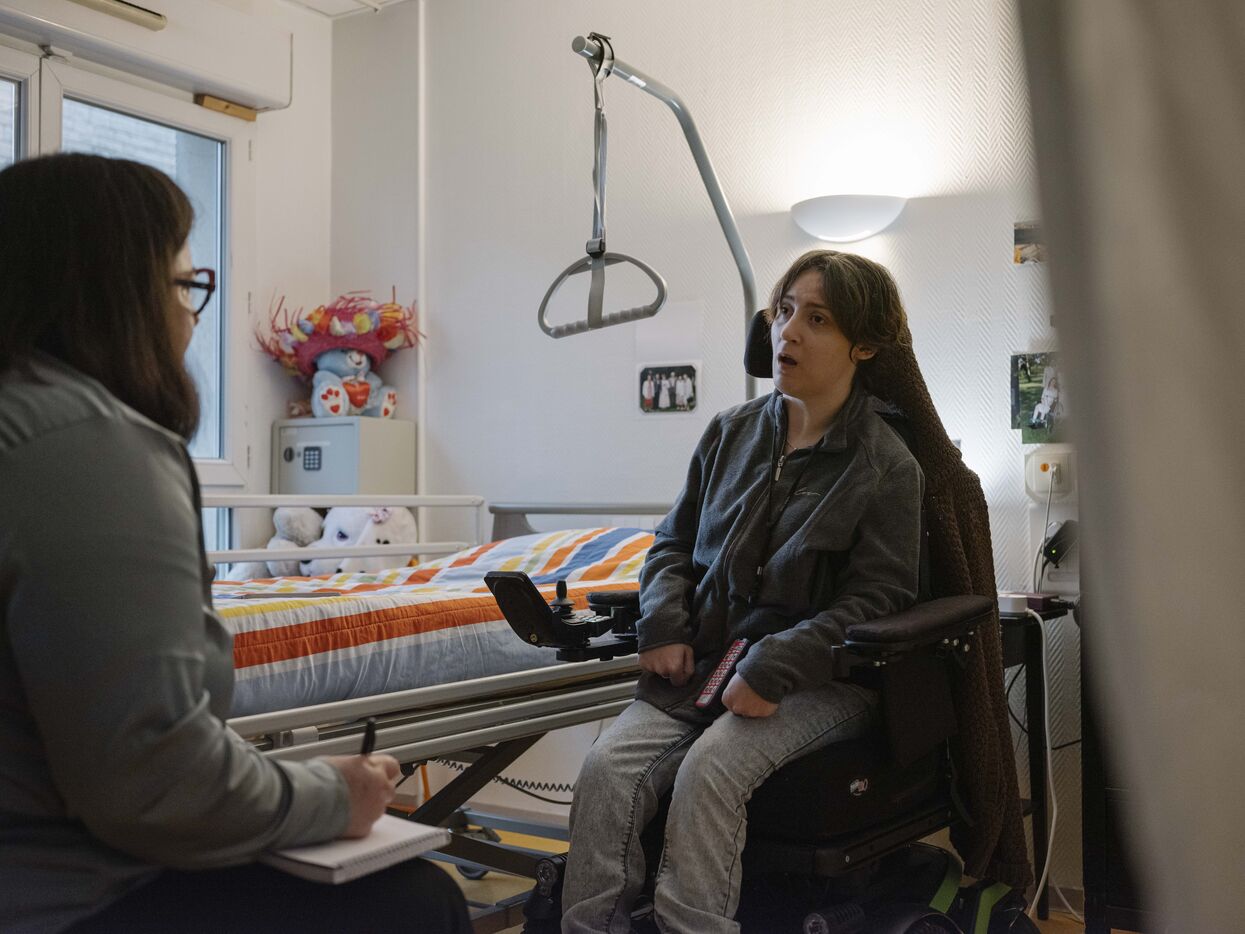 Laure Senemaud Herrera-Carriquiry, sage-femme, anime un atelier au Foyer d'Accueil Médicalisé APF, dans le cadre de la démarche Handigynéco, un parcours de soins gynécologiques dédié aux femmes en situation de handicap accueillies dans des établissements médico-sociaux (ESMS) médicalisés (FAM-MAS) et porté par l’ARS Île-de-France depuis 2023.