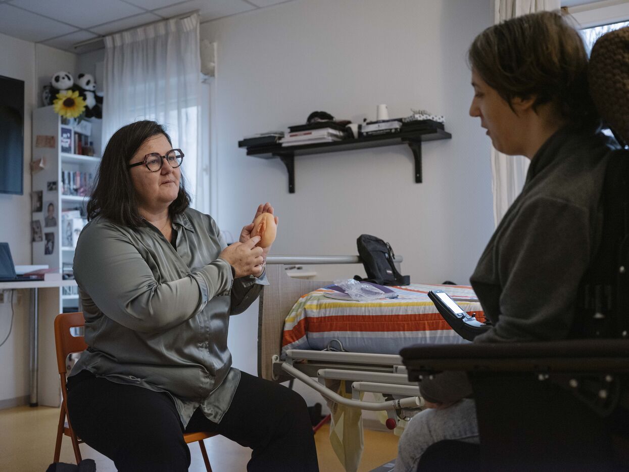 Laure Senemaud Herrera-Carriquiry, midwife, leading a workshop at the Foyer d'Accueil Médicalisé APF, as part of the Handigynéco initiative, a gynecological care pathway dedicated to women with disabilities accommodated in medicalized medico-social establishments (ESMS) (FAM-MAS) and supported by ARS Île-de-France since 2023.
