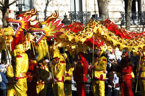 La communauté chinoise fête le nouvel an lunaire dans le monde entiers. De très nombreuses festivités traditionnelles sont organisées à Cette occasion. C'est le cas dans de nombreux arrondissements de Paris. Les Champs Elysées accueillent notamment une parade avec des groupes de danseurs chinois ou non qui perpétuent la tradition dans une ambiance de fête entourés d'un très nombreux public.