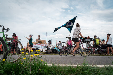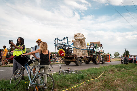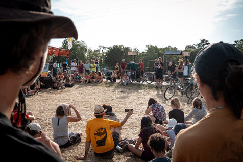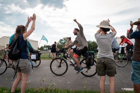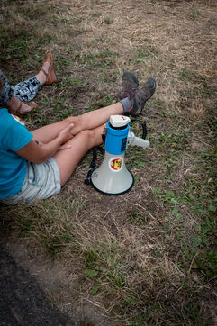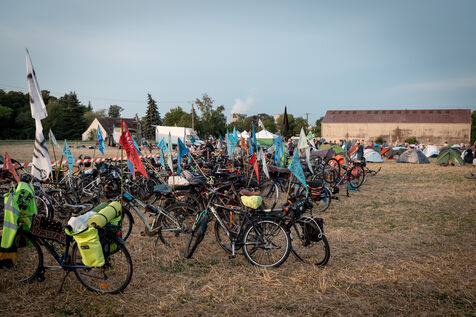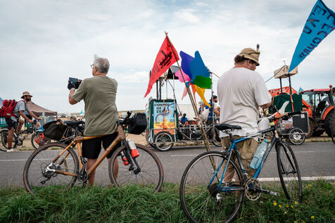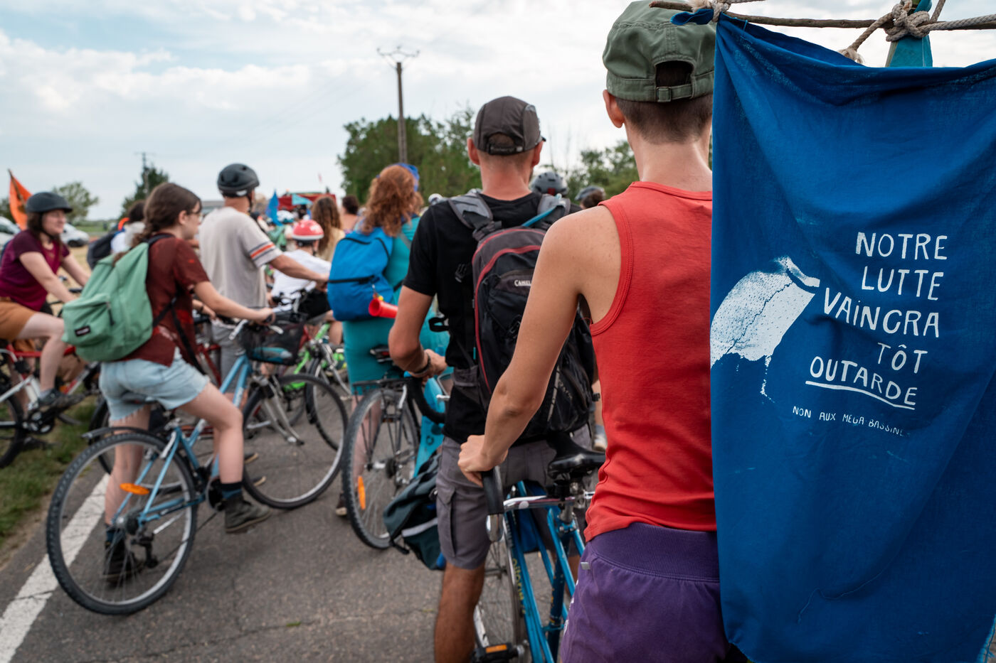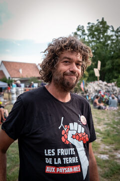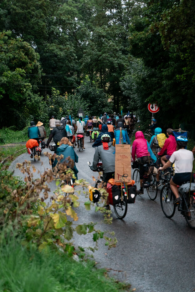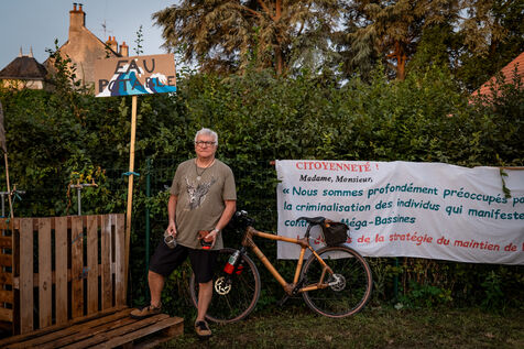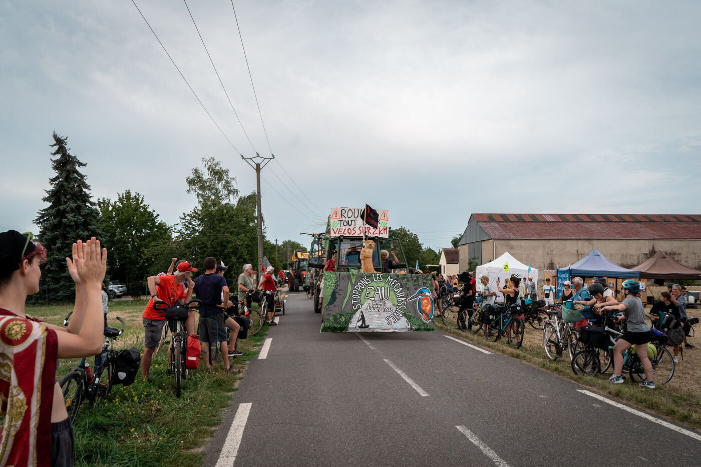 After setting off from Sainte-Soline, the site of a demonstration against the mega basins, the water convoy organized by Les Soulevement de la Terre, which included the Confederation Paysanne, RAFU and Bassines Non Merci, stopped off in Lestion. The camp is hosted in a farmer's field, not far from the nuclear power plant.