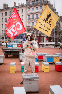 Action des apiculteurs.ices contre la mise en pause du plan ecophyto qui vise à réduire à 50% les usages de pesticides. Ils demandent des réglementations pour stopper les importations de miel à bas prix et des prix rémunérateurs.