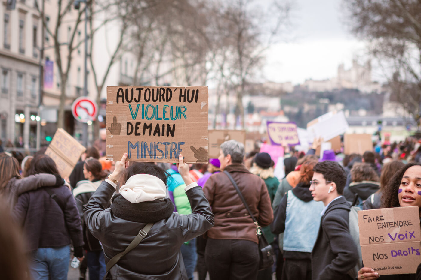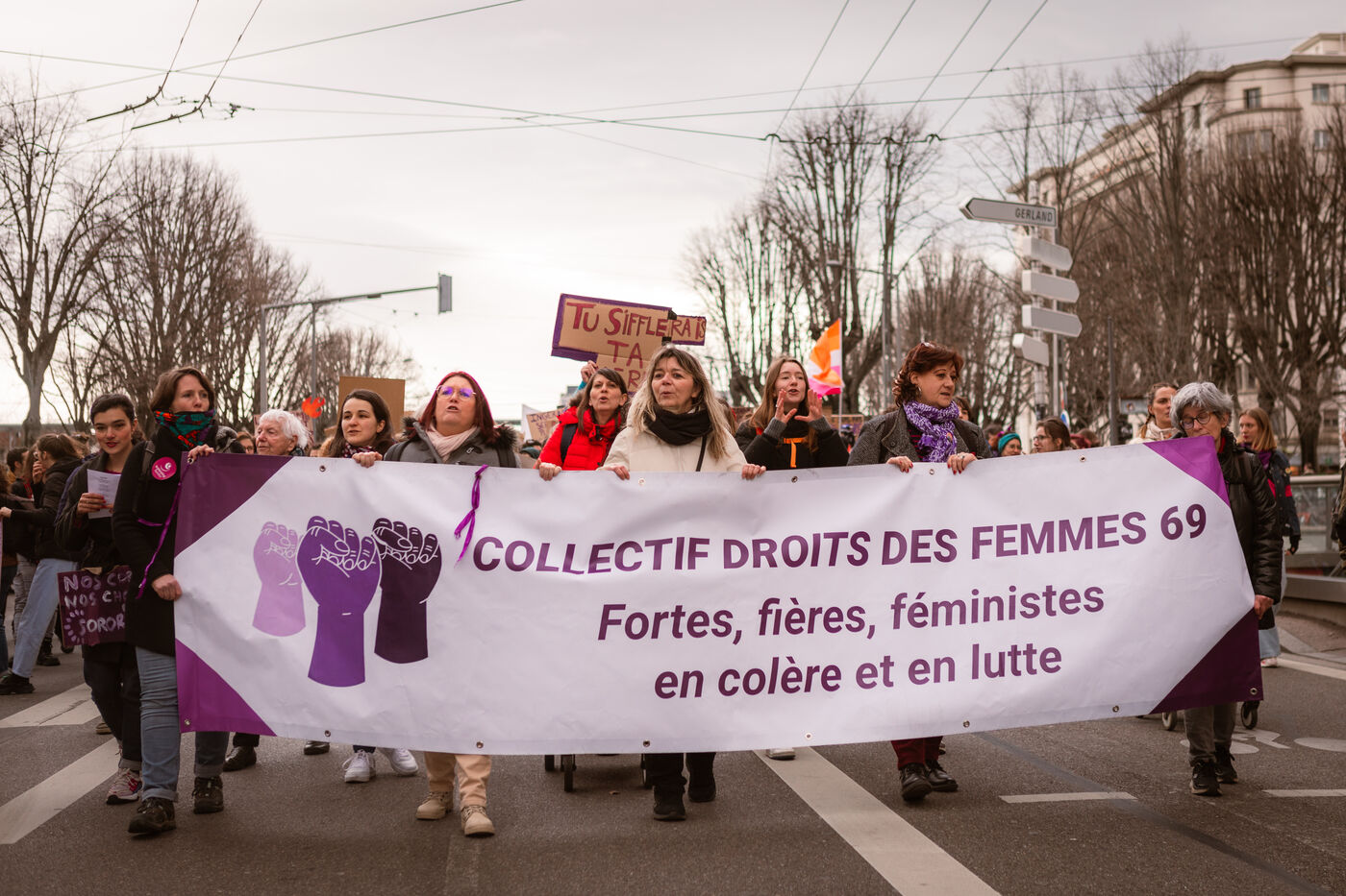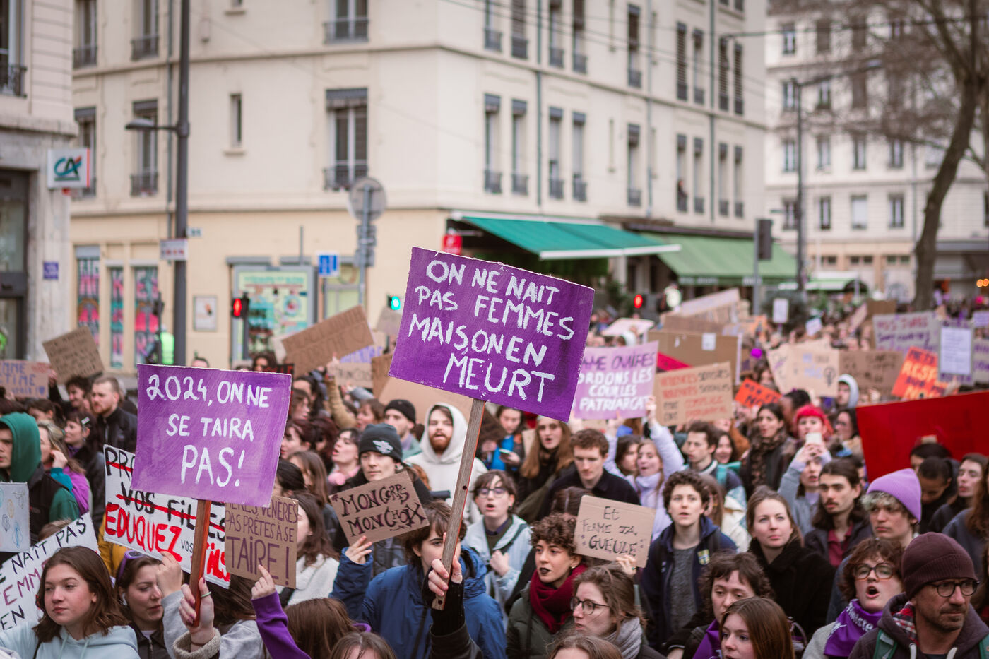 Grève féministe Nationale le 8 Mars 2024, manifestation à l'appel du Collectif Droits des Femmes 69 pour la journée internationale de lutte pour les droits des femmes et minorités de genre. À Lyon des milliers de personnes ont déambulé dans les rues pour revendiquer leurs droits et leur soutien dans la lutte féministe.