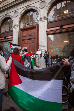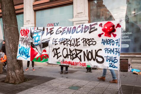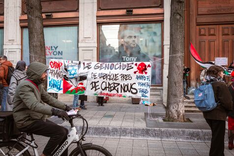 Rassemblement devant la CCI de Lyon (Chambre de Commerce et d'Industrie) à l'appel du Collectif 69 Palestine pour la journée mondiale d'action contre les entreprises d'armement complices du génocide, afin d'exiger la fin de l'armement de l'armée criminelle d'Israël.