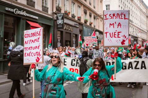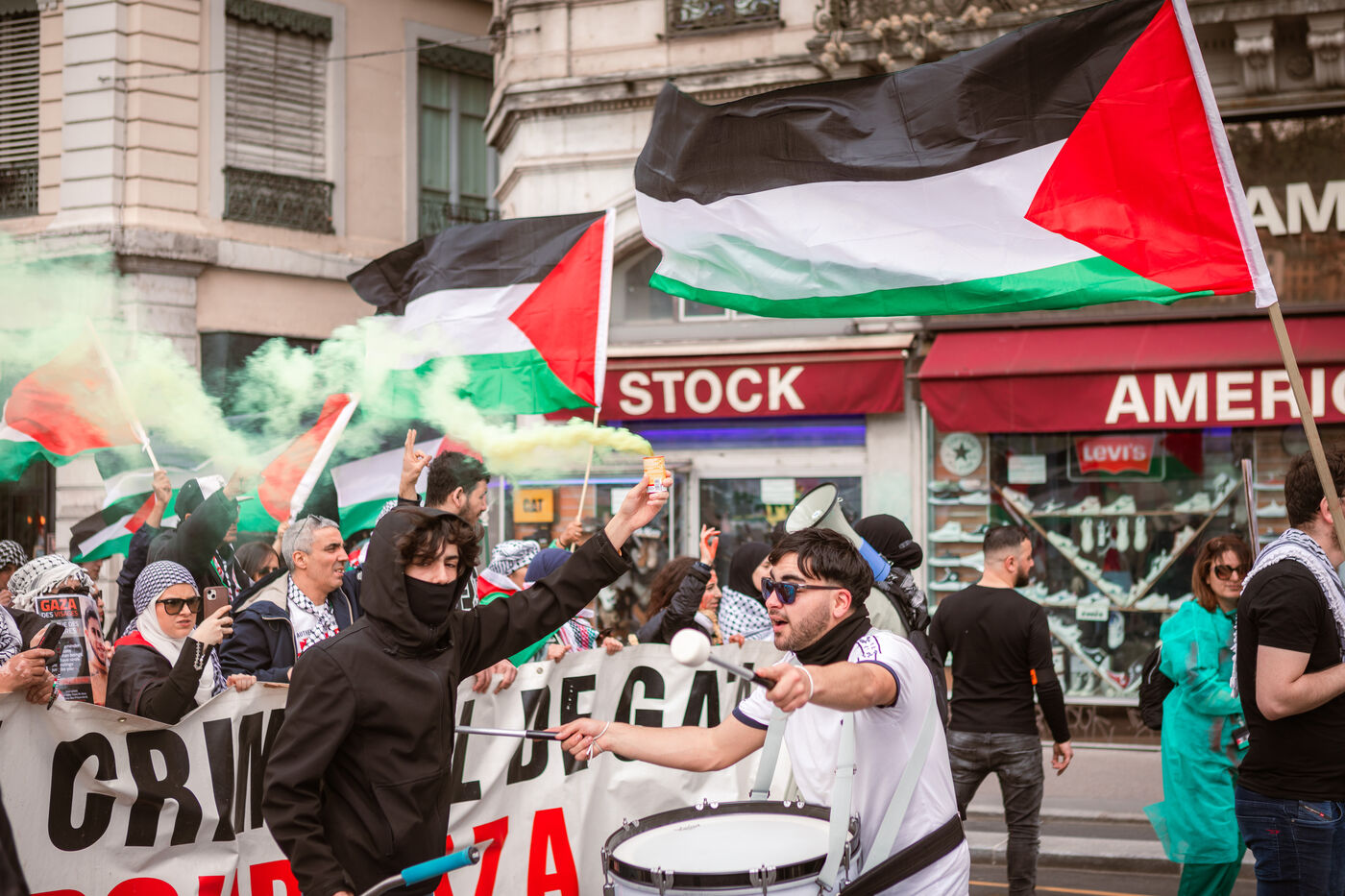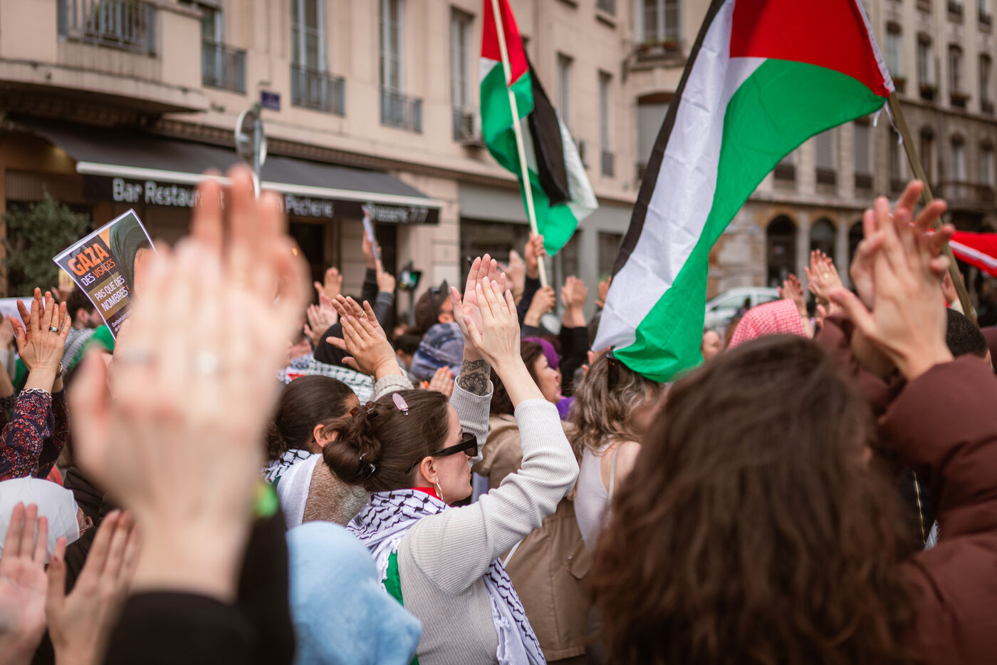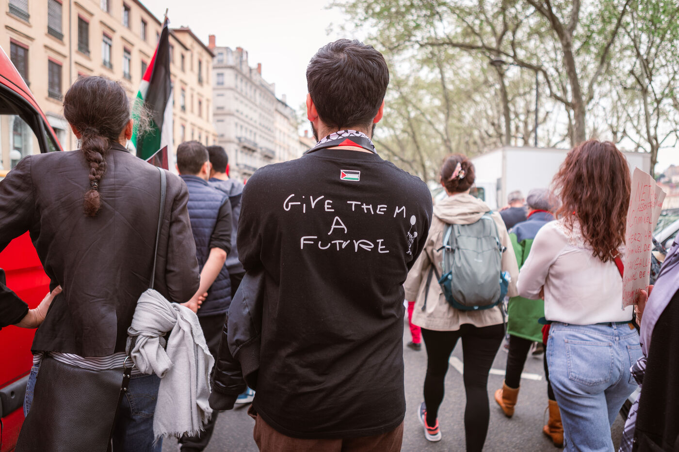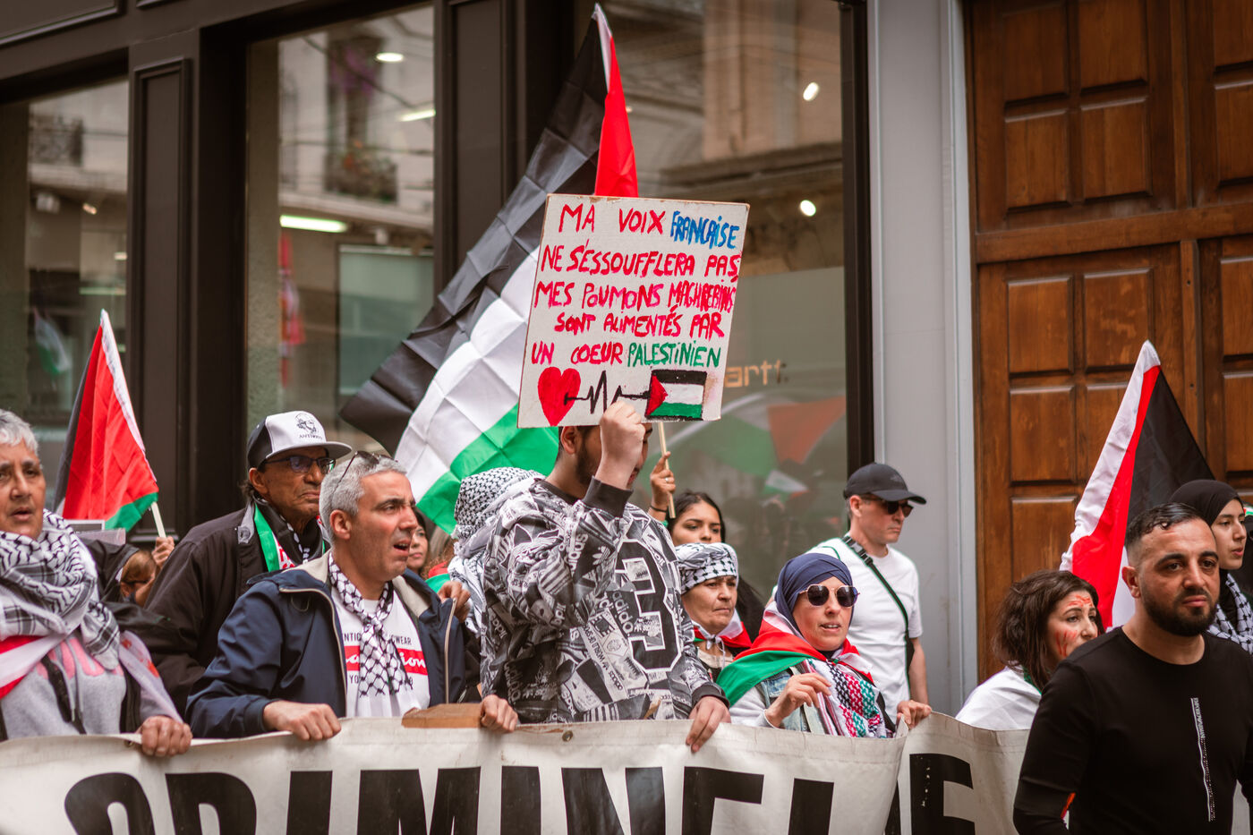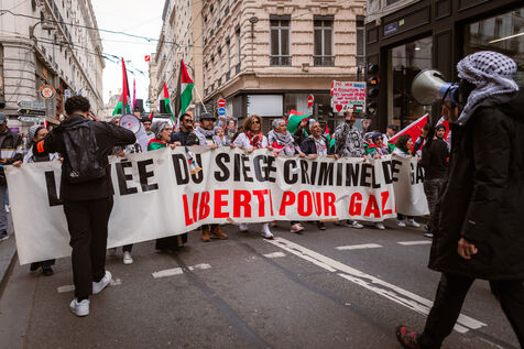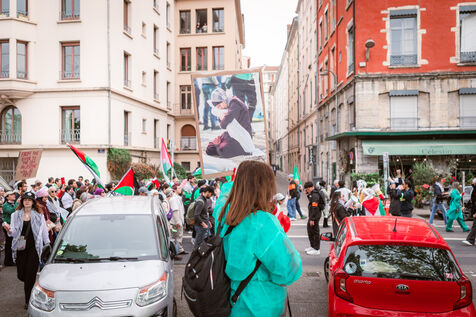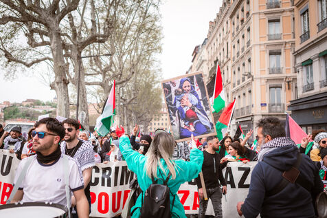 Manifestation à l'appel du Collectif 69 Palestine le 6 avril 2024 à Lyon, pour exiger un cessez-le-feu immédiat et permanent pour la bande de Gaza, l'arrêt des bombardements et des déplacements forcés des populations.