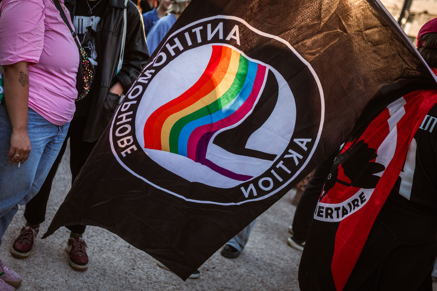 Rassemblement contre la transphobie et la tenue d’une conférence transphobe par Marguerite Stern à Lyon, le 19 septembre 2024, au sein de l’école ISSEP, fondée par Marion Maréchal. Marguerite Stern a co-écrit le livre “TRANSMANIA” avec Dora Moutot, aux propos transphobes.