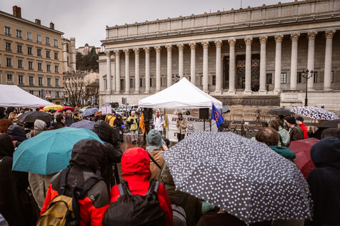 A rally to the call of Extinction Rébellion and Youth For Climate Lyon in support of the 8 accused of civil disobedience action against Arkema took place outside the Palais de Justice in Lyon, France on 11 February 2025.