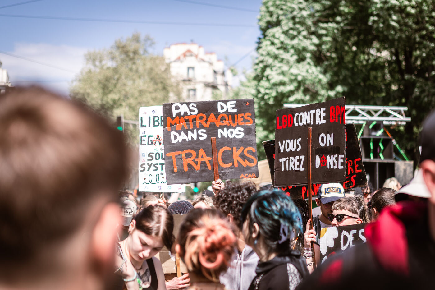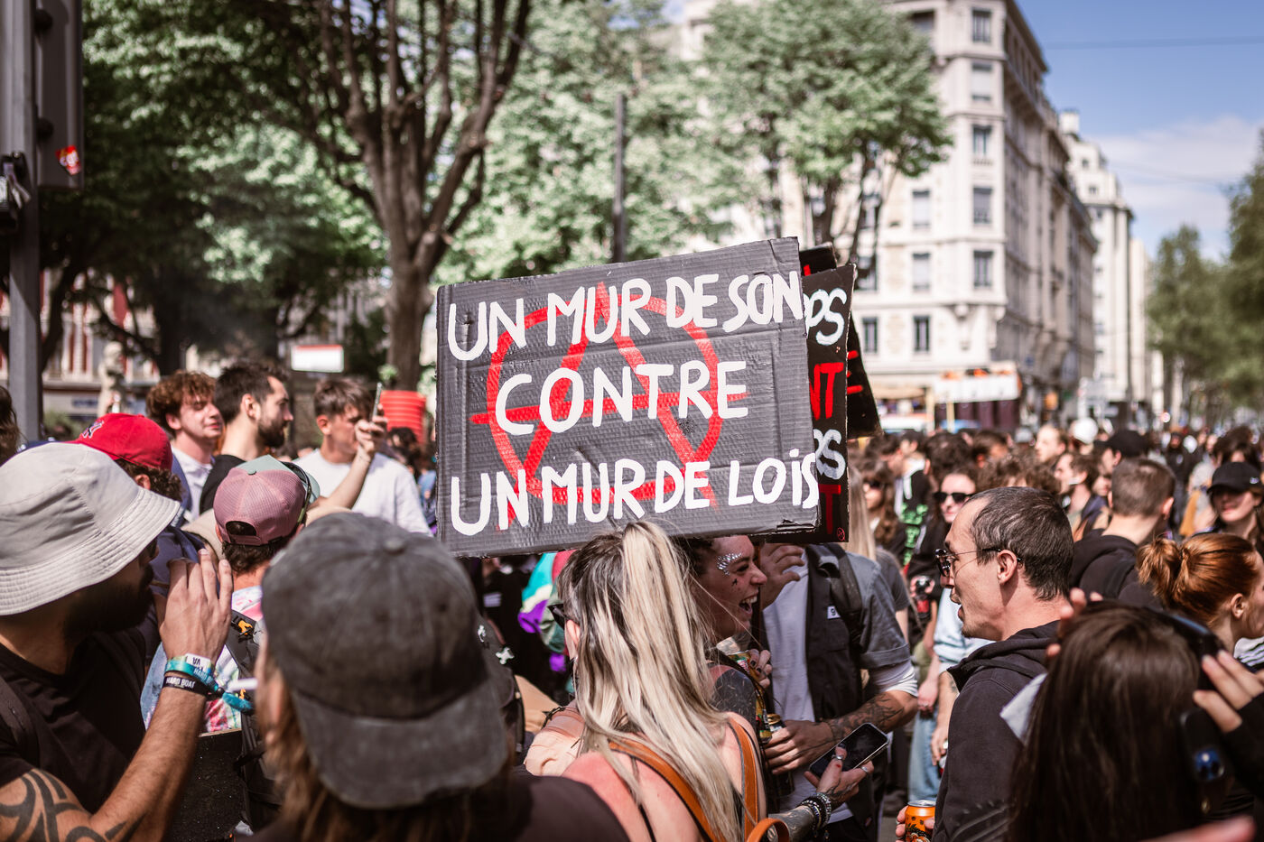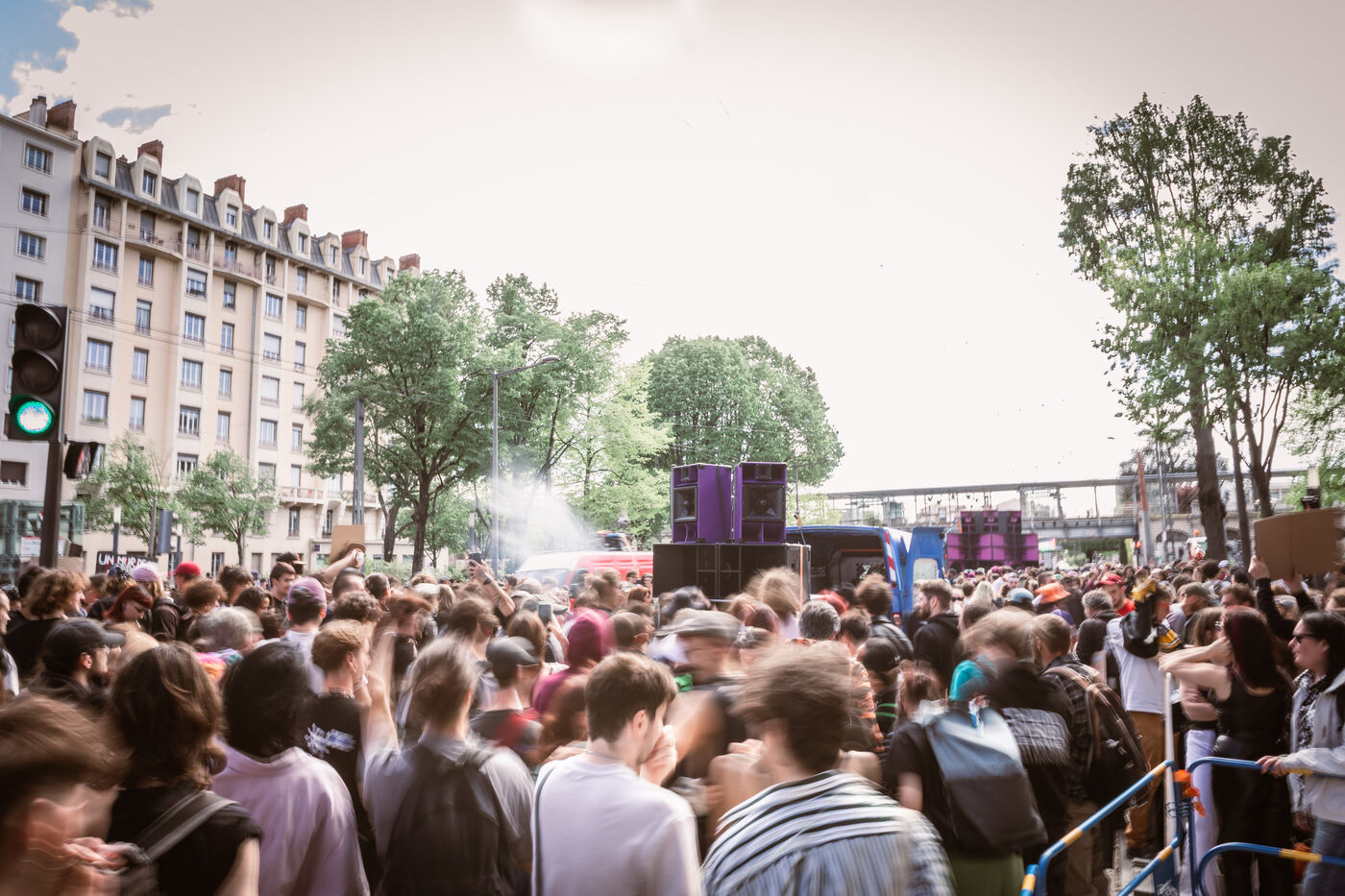 A festive demonstration took place in defense of the free party and against repression in Lyon, France on April 12, 2025.