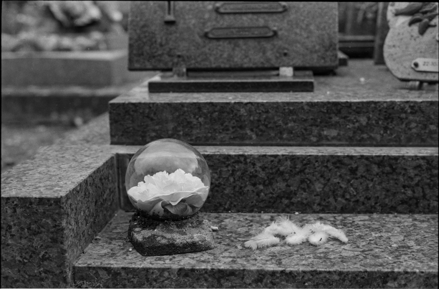 Dans les cimetières, on note la présence des vivants par ce qu'ils laissent sur les tombes, mais aussi leur absence par les traces du temps sans intervention et donc sans visite.